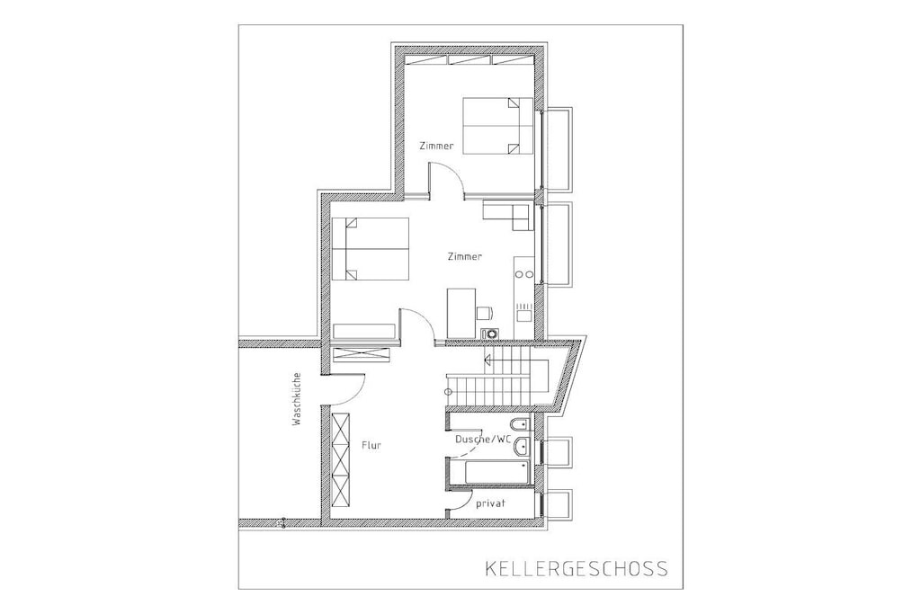 Een slaapkamer op de eerste verdieping is open naar de trap en dient als een tussenkamer. Op de benedenverdieping is een van de twee slaapkamers ook een tussenkamer.