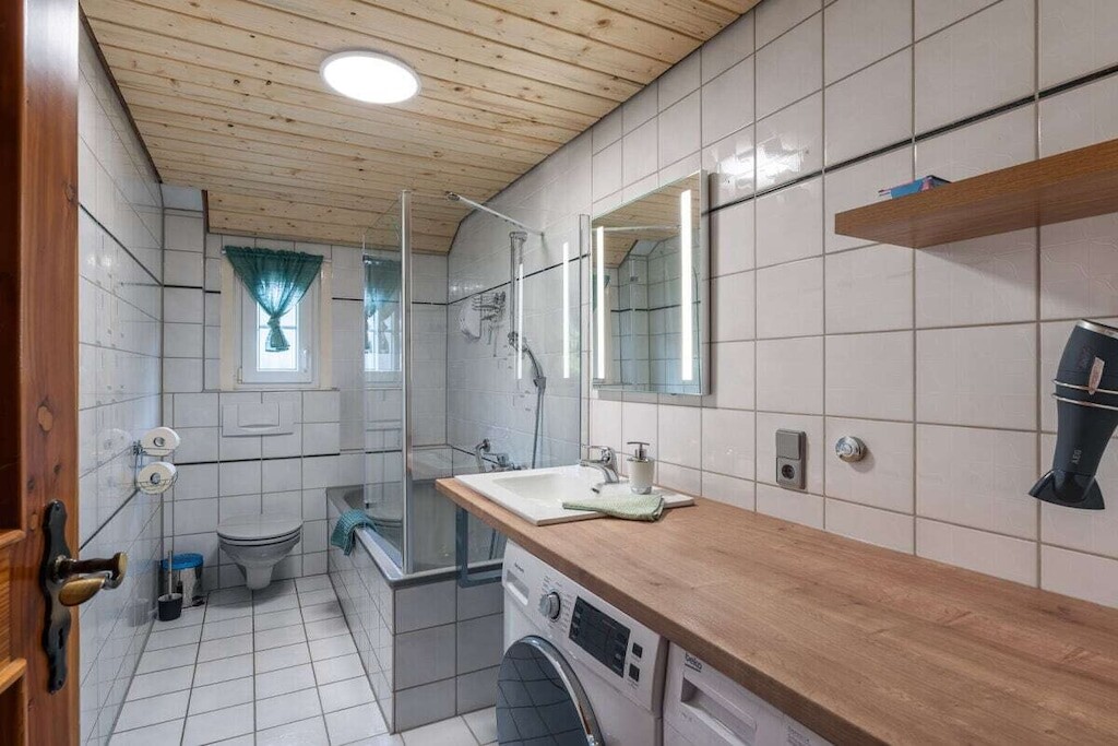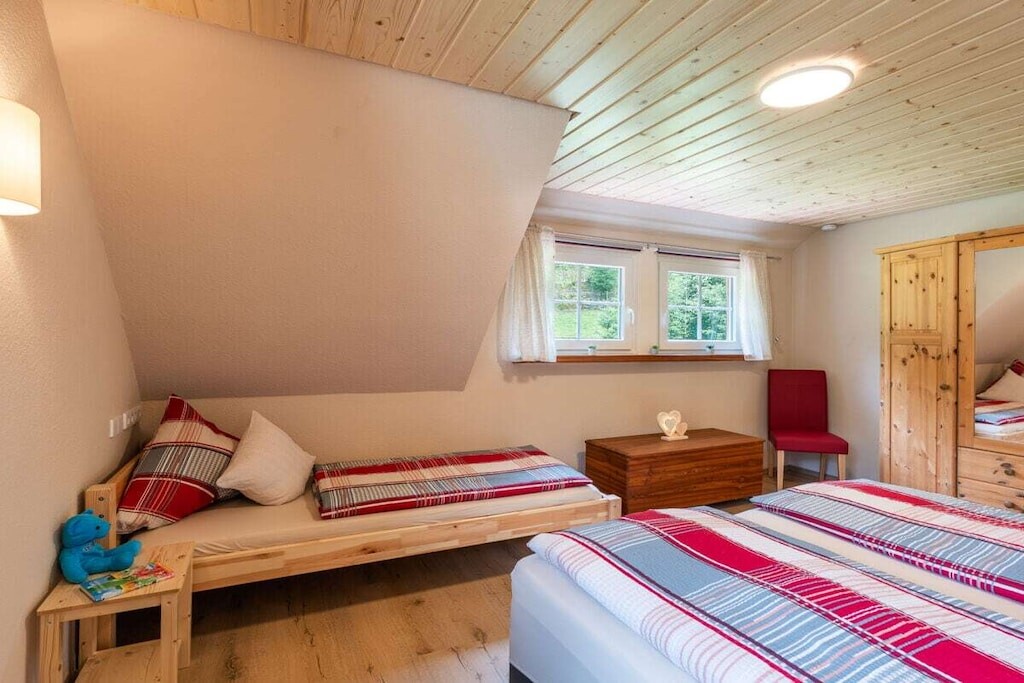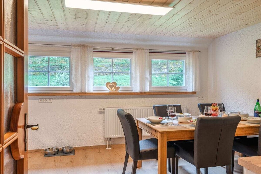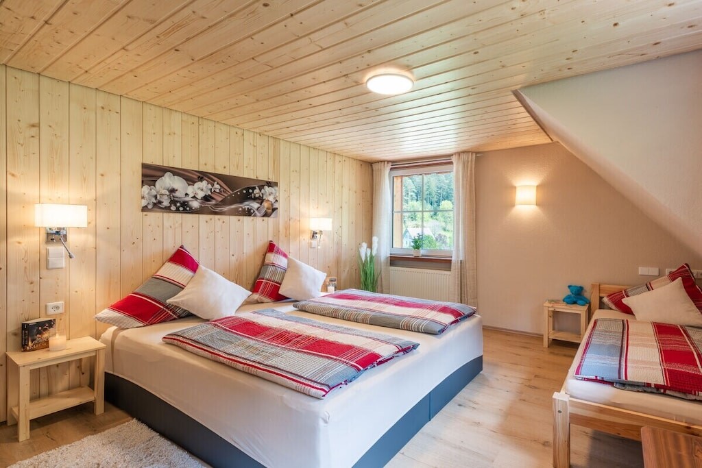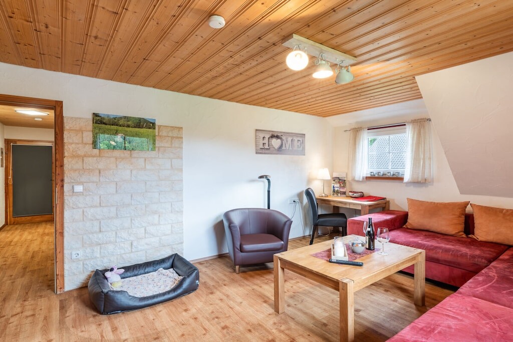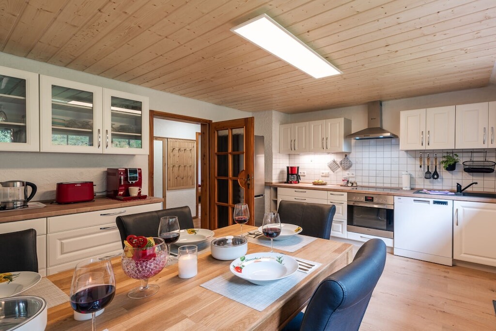 Welkom in uw exclusieve vakantiewoning in moderne Zwarte Woud-stijl met deels massief houten meubels en hotelkarakter. De gezellige woonkamer met een grote hoekbank en satelliet-tv nodigt u uit om te ontspannen en tot rust te komen. U vindt er een goed uitgeruste woon-eetkamer met moderne elektrische apparatuur voor uw dagelijkse behoeften (vaatwasser, volautomatische koffiemachine, waterkoker, koel-vriescombinatie) en een eettafel voor 6 personen. De grote slaapkamer is ingericht met een boxspringbed en een eenpersoonsbed en de kleine slaapkamer met twee eenpersoonsbedden. De badkamer met daglicht is voorzien van een wastafel, toilet, ligbad met douche, wasmachine en droger. Op zolder bevindt zich tevens een slaapkamer met een badkamer met daglicht. Kinderen tot 2 jaar en 3 honden verblijven gratis en zijn welkom