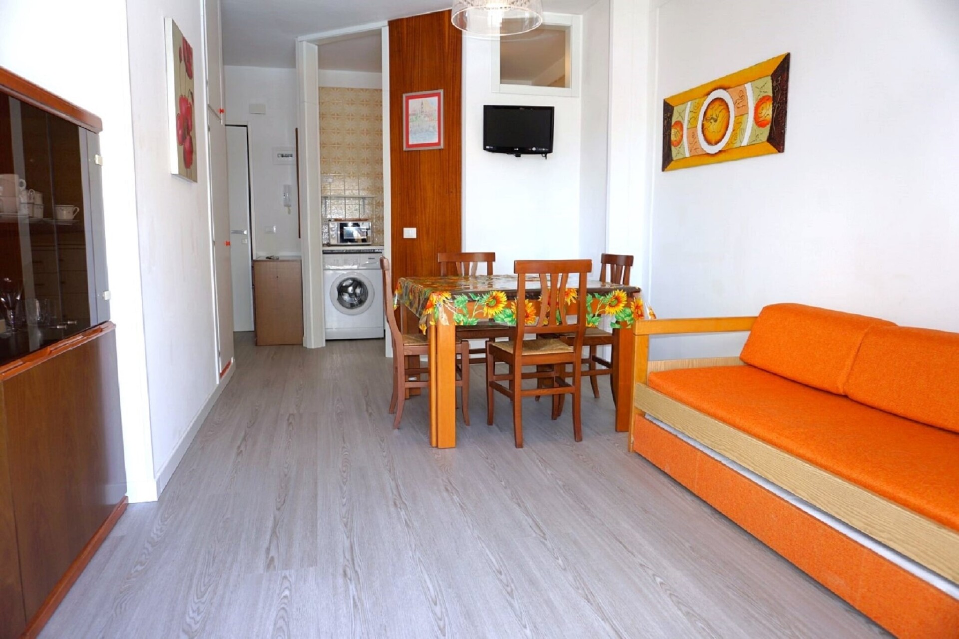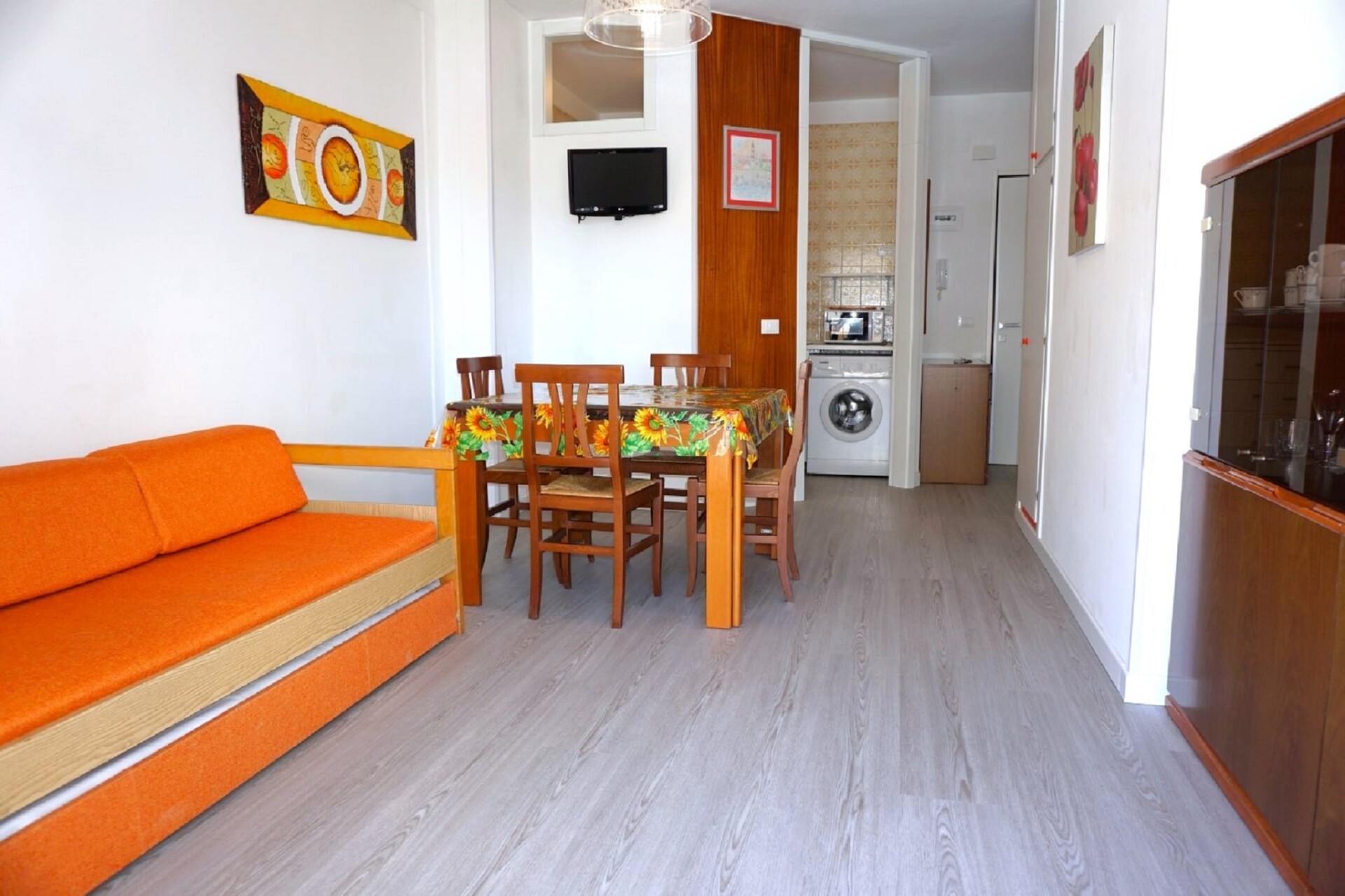 Welkom in uw gezellige toevluchtsoord op de 5e verdieping, ideaal gelegen in het pittoreske kustplaatsje Porto Santa Margherita. Dit heerlijke appartement is perfect voor stellen, kleine gezinnen of vrienden die op zoek zijn naar een ontspannend uitje aan zee. De lichte en luchtige woonkamer beschikt over een comfortabele tweepersoons slaapbank en een tv, wat een uitnodigende ruimte creëert om te ontspannen. Verzamel rond de eettafel voor maaltijden en gesprekken, en geniet van de uitnodigende zithoek na een dag vol verkenning. De goed uitgeruste open keuken beschikt over moderne voorzieningen, waaronder een kookplaat, magnetron, koel-vriescombinatie en wastafel, waardoor het bereiden van maaltijden gemakkelijk is, of u nu een snel ontbijt of een uitgebreid diner klaarmaakt.