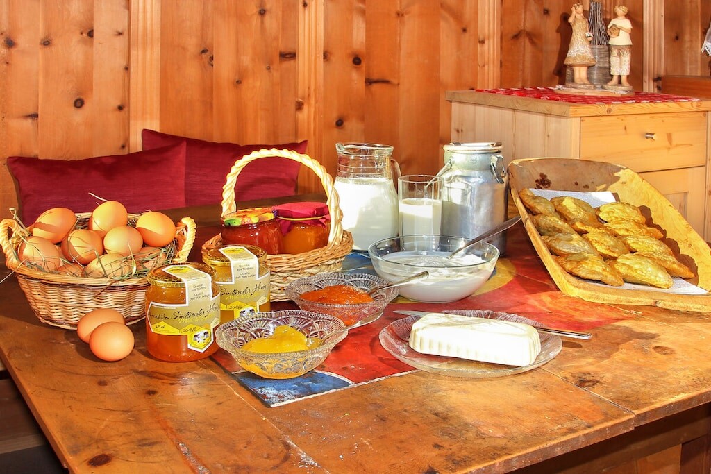 Voor het ontbijt bieden we producten van onze eigen boerderij aan, zoals melk, yoghurt, boter, jam en eieren.