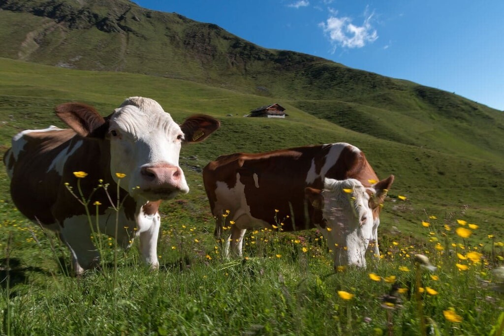 Op onze boerderij houden we koeien, geiten, kippen, konijnen en katten.