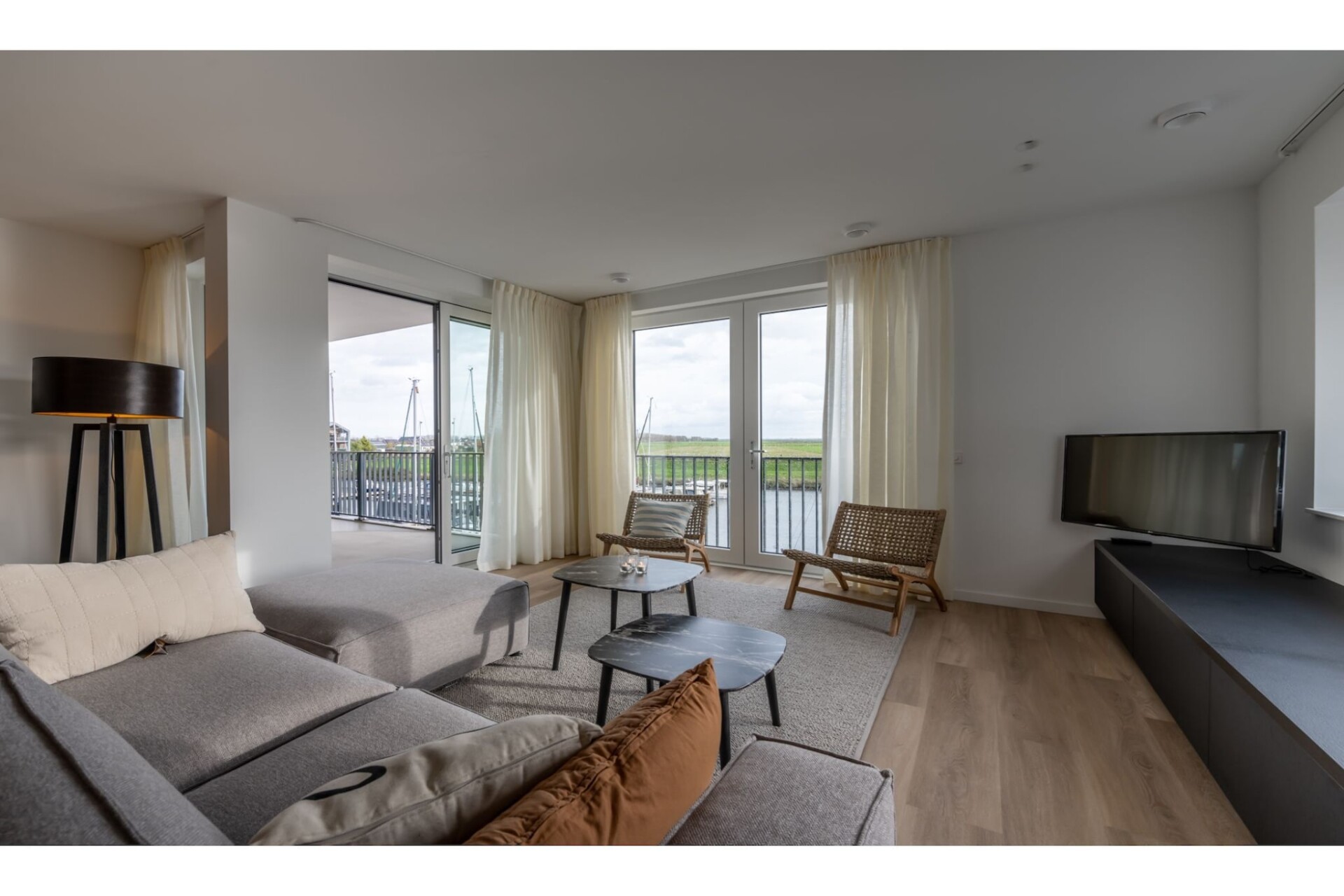 De gezellige woonkamer beschikt over een comfortabele zithoek en een Smart TV met buitenlandpakket. Vanuit hier bereikt u het ruime, overdekte terras op het zuiden, compleet met luxe tuinmeubelen en terrasverwarming—perfect om tot laat te genieten van het uitzicht op de jachthaven en het Veerse Meer.