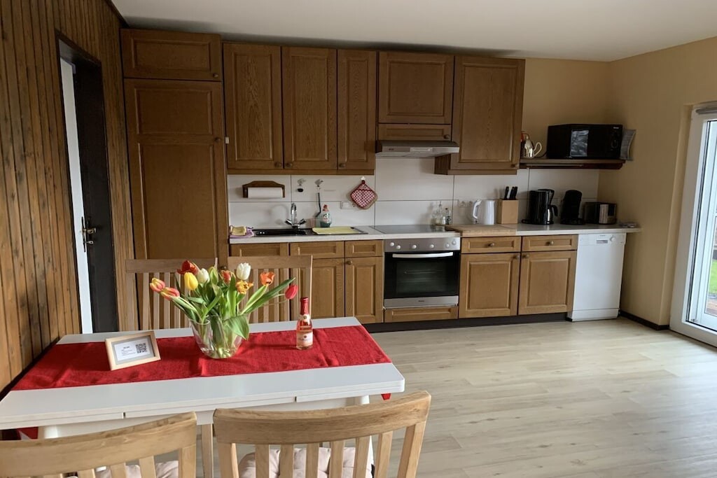 De vakantiehuizen beschikken over een gecombineerde woon- en keukenruimte met een flatscreen-tv en een volledig uitgeruste kitchenette met een koelkast (met geïntegreerde vriezer), elektrisch fornuis met oven, vaatwasser, magnetron, filterkoffiezetapparaat, Senseo-apparaat, waterkoker, broodrooster en voldoende servies. Een wasmachine is ook beschikbaar. De ruime, volledig omheinde buitenruimte biedt een groot terras, tuinmeubelen, een barbecue en speeltoestellen (klimrek met glijbaan en zandbak, voetbalgoal, trampoline), evenals diverse banken. Zindelijke honden zijn welkom.