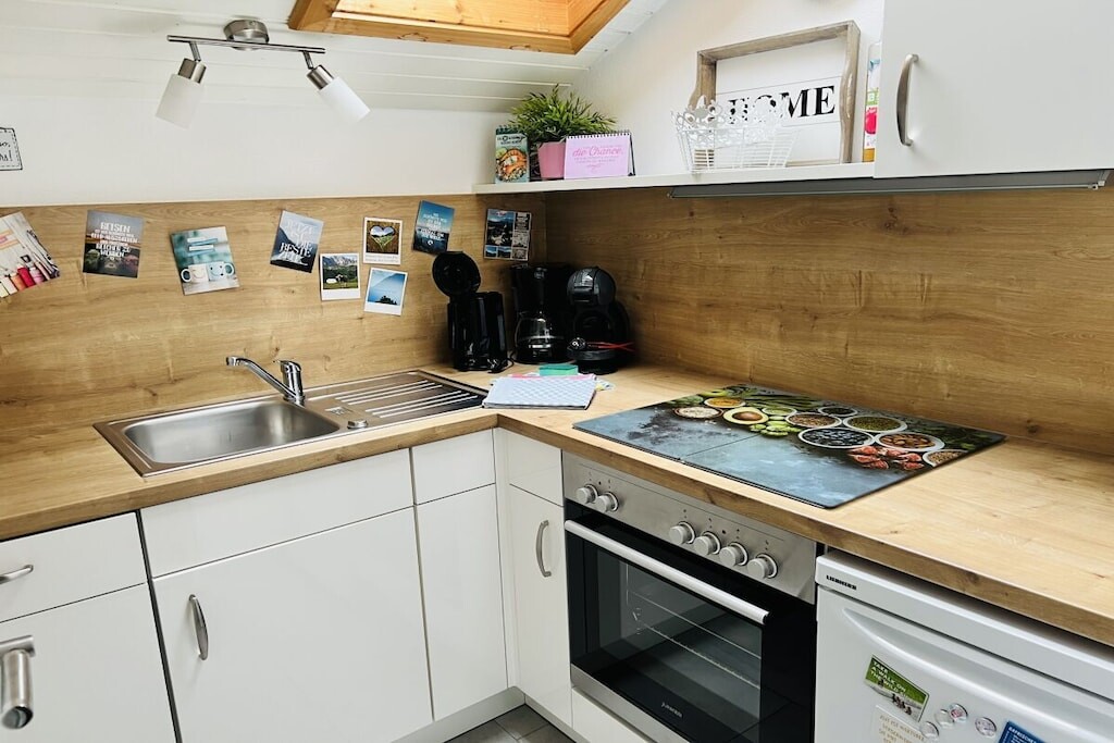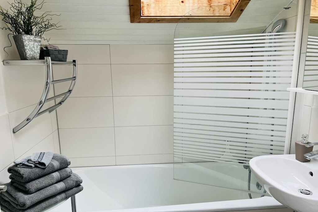 Alleen in de zomer: op aanvraag bieden we een zolderkamer aan, grenzend aan de woonkamer (niet hoog genoeg om rechtop in te staan). Deze kamer is erg populair bij kinderen, heeft een schuin plafond en een raam, en is ongelooflijk gezellig met twee palletbedden (1,40 m breed en 1 m breed), een vloerkleed, boeken, speelgoed en meer. Spelletjes, dvd's, cd's en boeken zijn aanwezig voor elke smaak.