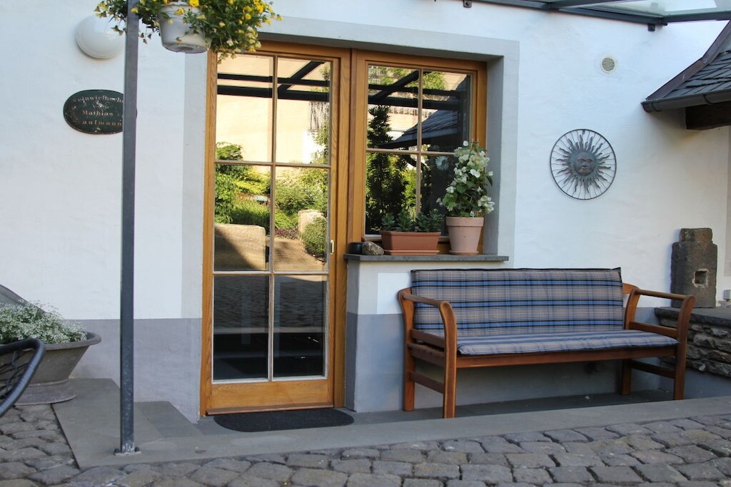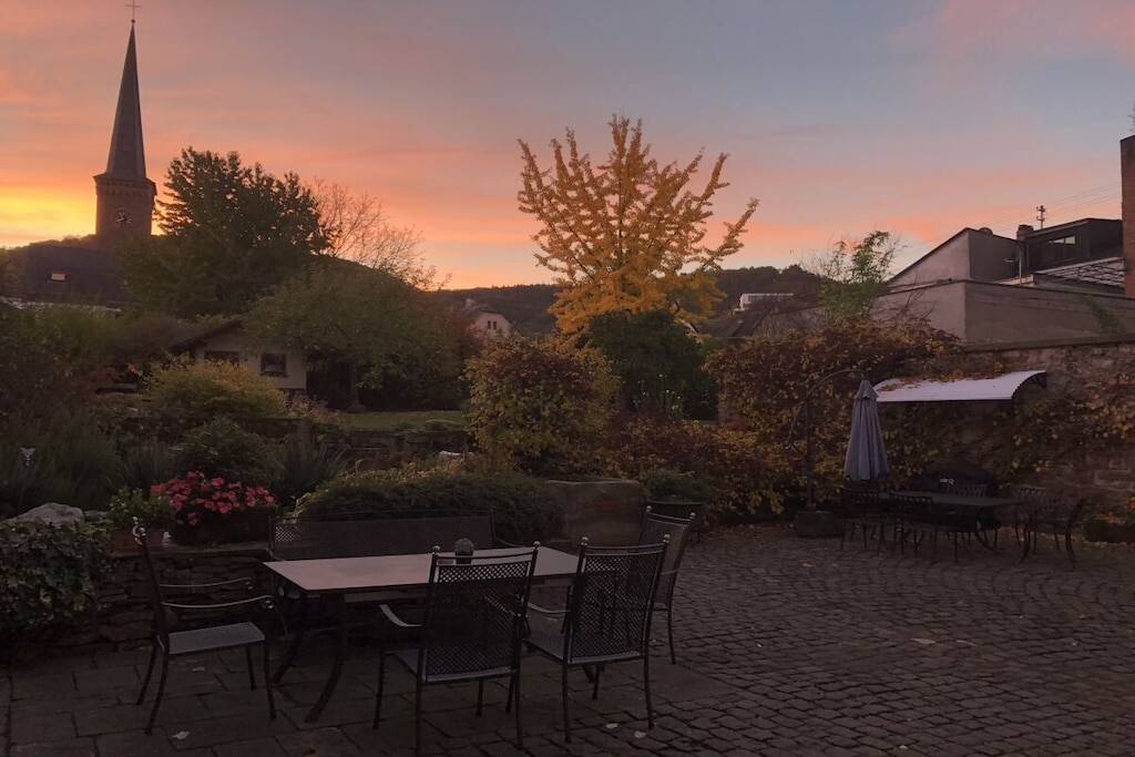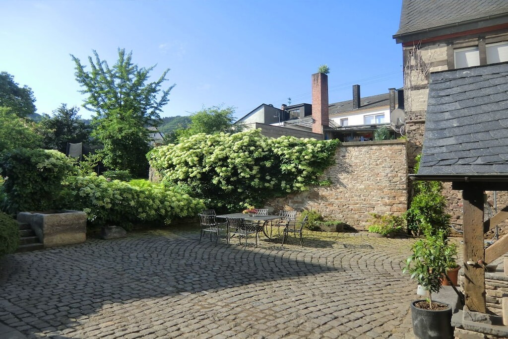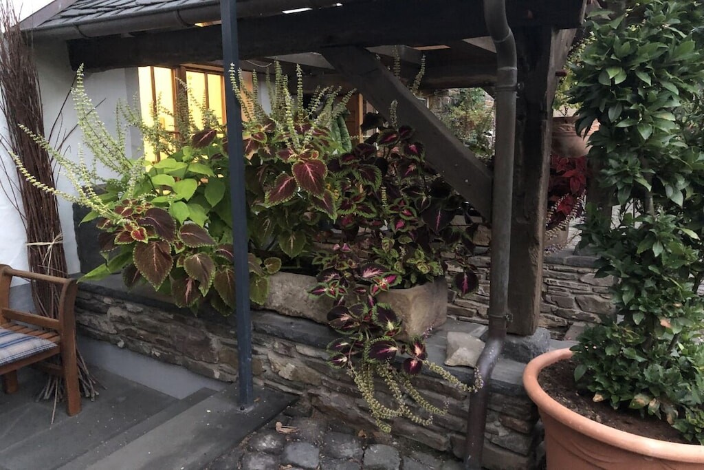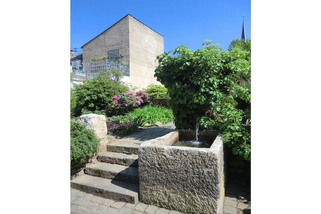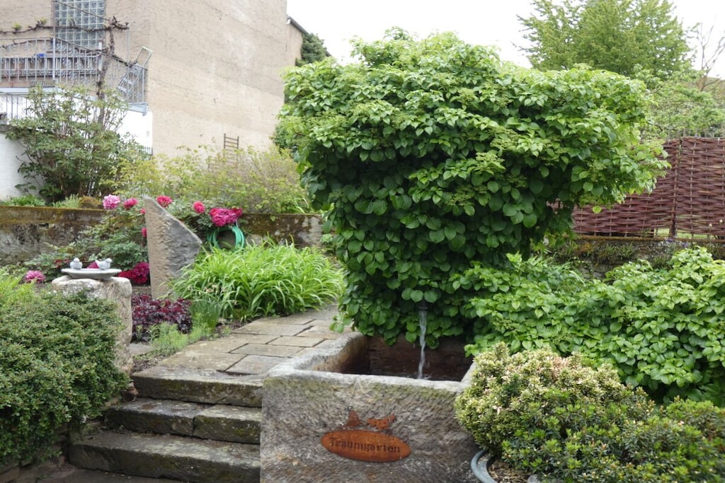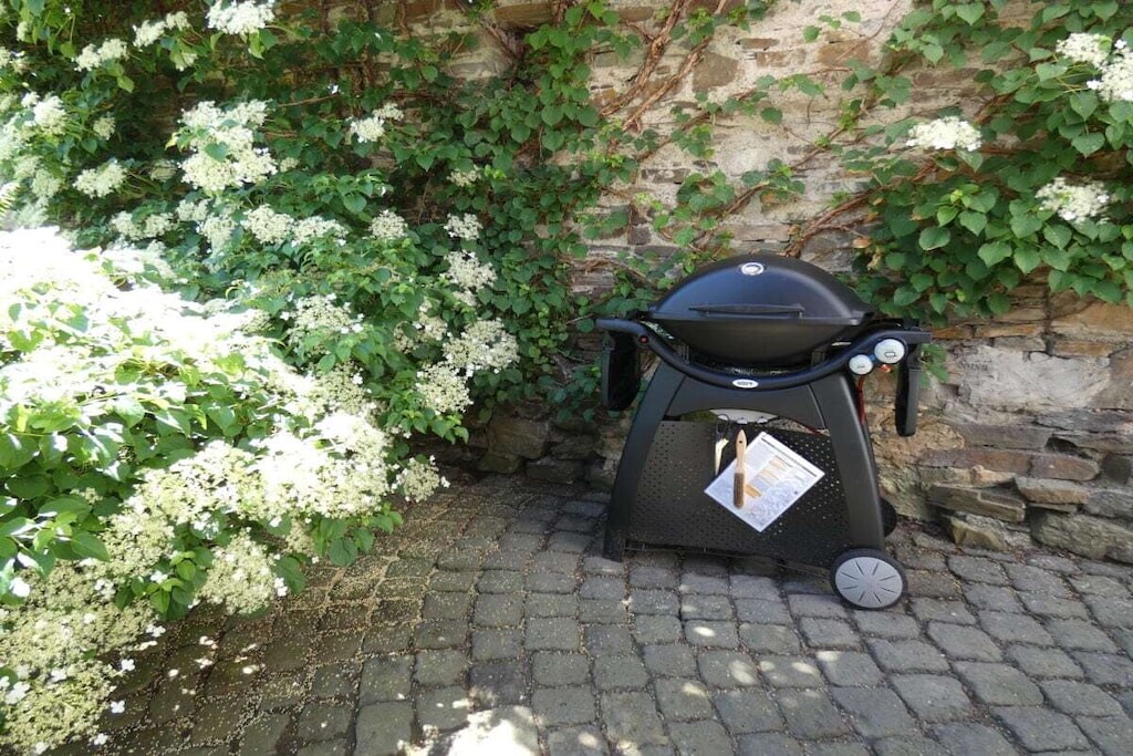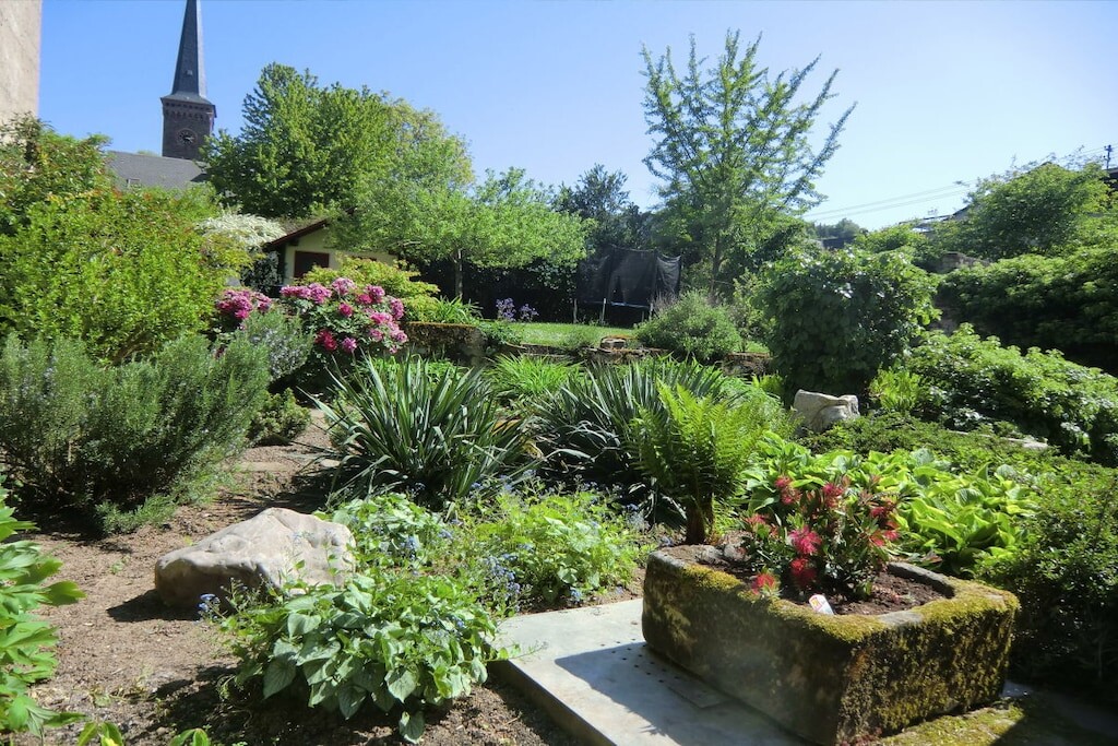 Een ruime buitenruimte met basaltbestrating, een fontein en zitgelegenheid nodigt uit tot barbecueën (Weber gasbarbecue) en gezellig samenzijn. Een gazon van 300 vierkante meter met ligstoelen, talloze struiken en varens, en, als kleine bijzonderheid, de boom van het millennium, een ginkgo biloba, wacht op u.