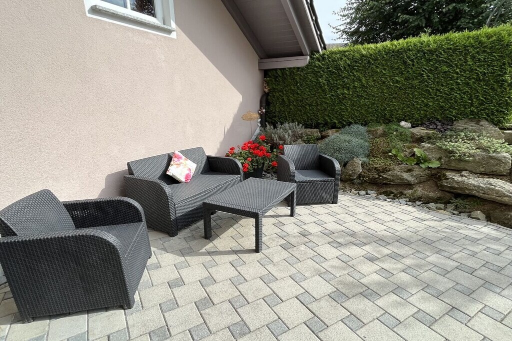 Een grote tuin en een terras met tuinmeubelen nodigen uit tot spelen, barbecueën en ontspannen.