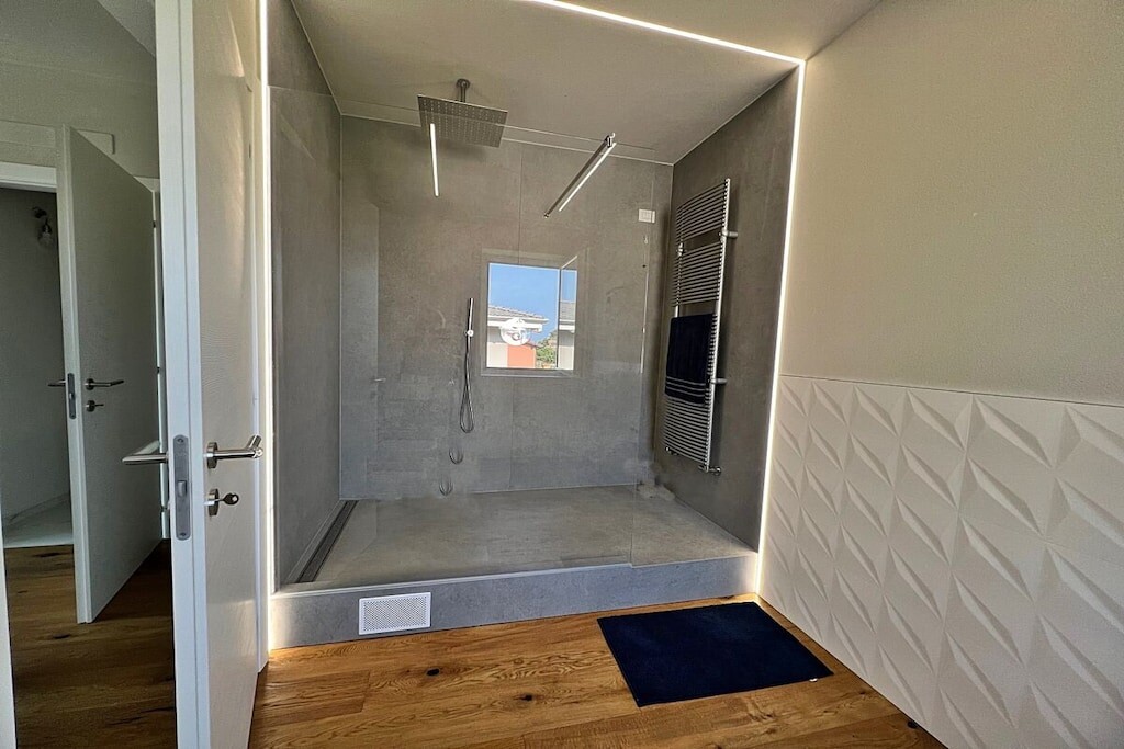 Vanuit de open woonkamer met leren bank en grote OLED-tv komt u in een slaapkamer, de zogenaamde tuinslaapkamer, met directe toegang tot het zwembad en de tuin, een badkamer en de derde slaapkamer: de glazen slaapkamer – gewoonweg fantastisch! Deze derde slaapkamer heeft een glazen wand, is geluiddicht en verduisterbaar, en beschikt over een tweede tv.