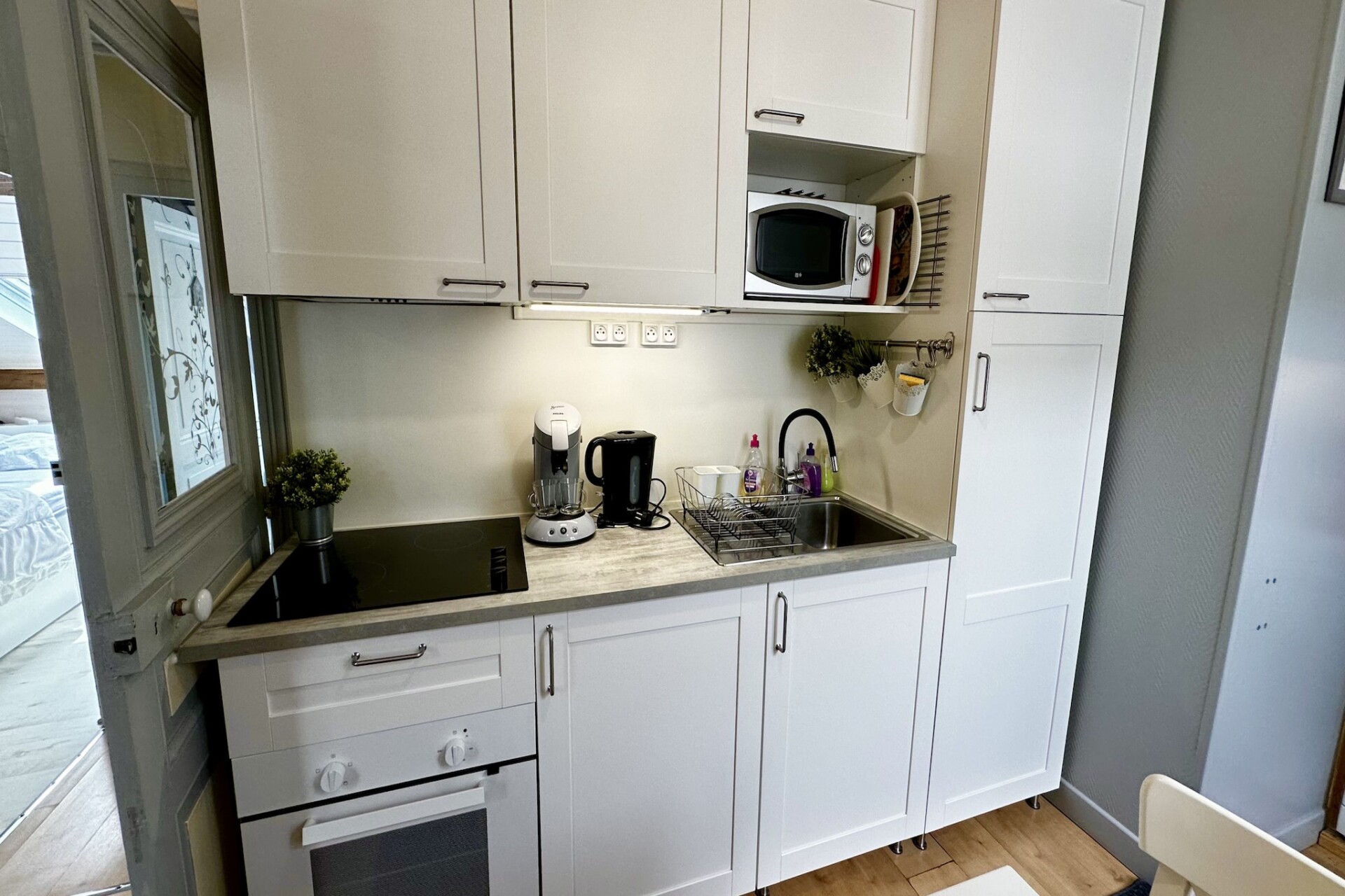 Het appartement heeft twee aparte slaapkamers, elk met een comfortabel tweepersoonsbed, en een extra slaapbank in de woonkamer voor flexibele groepsindelingen. De lichte woonkamer is voorzien van een televisie en zitruimte voor ontspannen avonden na uitstapjes in de buitenlucht. Er is een volledig uitgeruste keuken beschikbaar voor dagelijkse zelfverzorging, met een keramische kookplaat, koelkast, oven, magnetron, koffiezetapparaat, raclettegrill en wafelijzer. Een wasmachine maakt het verblijf voor langere tijd nog praktischer, terwijl de badkamer met douche en verwarmd handdoekenrek zorgt voor dagelijks comfort. Er is ook gratis wifi beschikbaar.