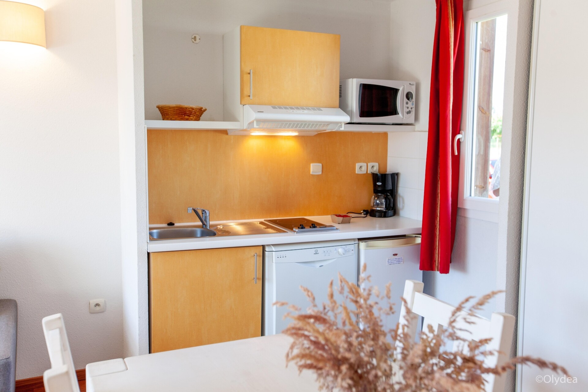 Binnen is de woon-eetkamer ingericht voor ontspannen avonden samen, met een tweepersoons slaapbank, tv en eettafel. De compacte maar volledig uitgeruste kitchenette met een koffiezetapparaat, vaatwasser en koelkast stelt u in staat om op uw gemak eenvoudige maaltijden te bereiden. De slaapkamer heeft twee eenpersoonsbedden en de moderne badkamer is voorzien van een douche en toilet voor dagelijks gemak. Airconditioning en verwarming zorgen voor comfort in elk seizoen.