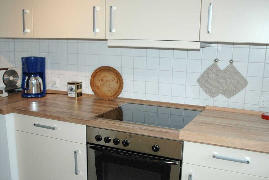 In de winter geniet u van de behaaglijke warmte van de tegelkachel in de ruime woonkamer. De woonkamer beschikt over een eethoek voor acht personen en een comfortabele bank. De volledig uitgeruste keuken is voorzien van een vaatwasser, oven, koelkast met viersterrenvriesvak, magnetron, koffiezetapparaat en meer.