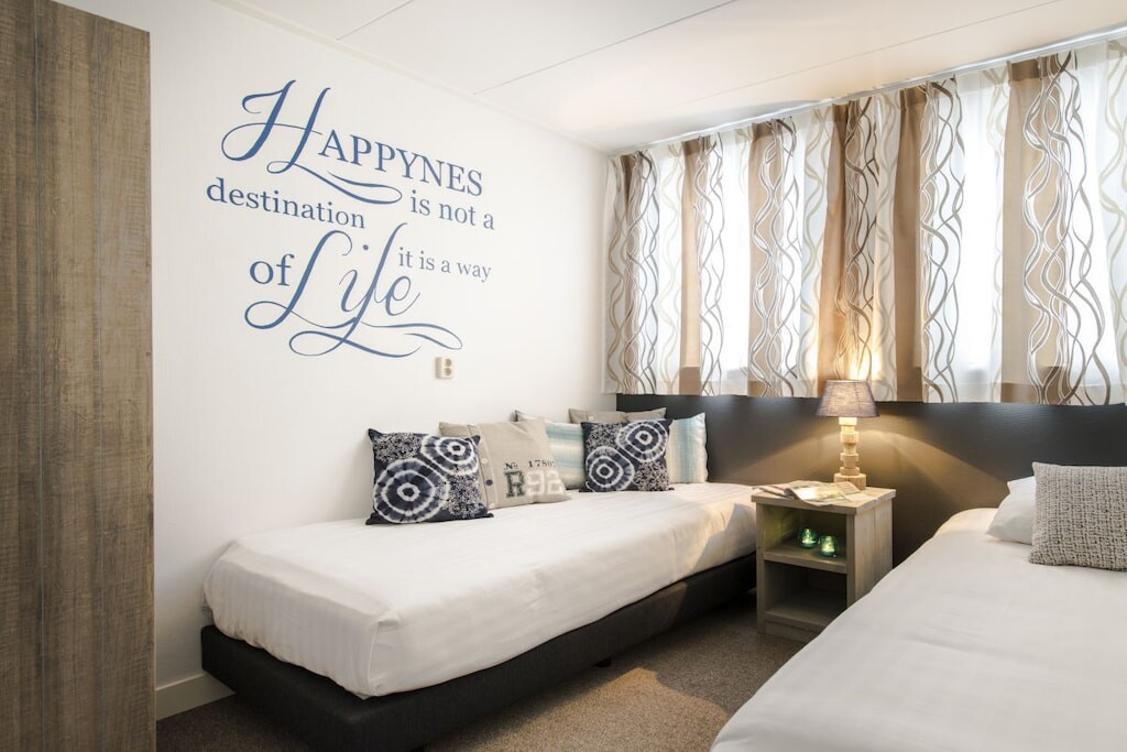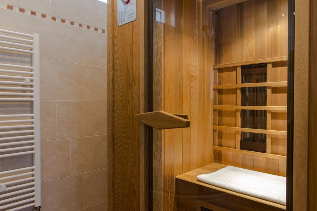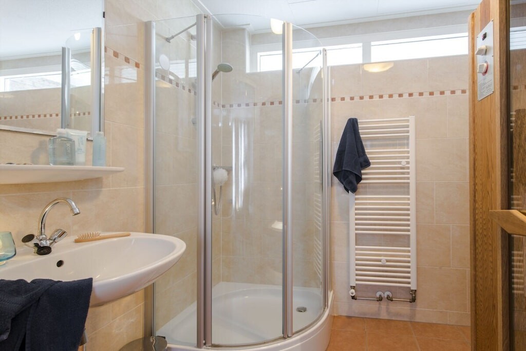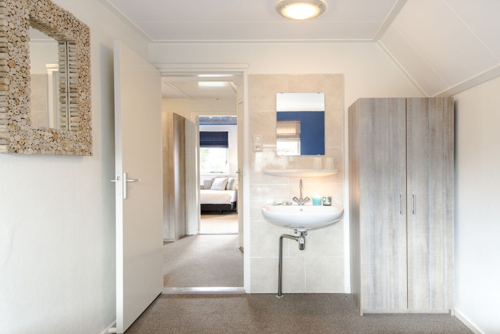 De ruime slaapkamer op de begane grond is voorzien van twee boxspringbedden en een kast. Aansluitend ligt de badkamer met wastafel, douche en infraroodsauna.