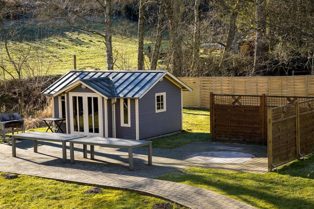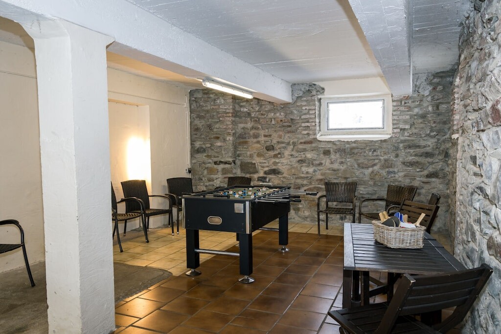 De trap geeft toegang tot de grote sauna, die op afspraak beschikbaar is. Kosten: € 25 voor 4 uur, daarna € 5 per uur. De wasruimte met warmtepompdroger is op aanvraag gratis beschikbaar. Het tuinhuis, gelegen aan een beekje, beschikt over een elektriciteitsaansluiting, een barbecue en tuinmeubilair en biedt voldoende ruimte. De tuin beschikt over een kinderspeelplaats met glijbaan en klimrek.