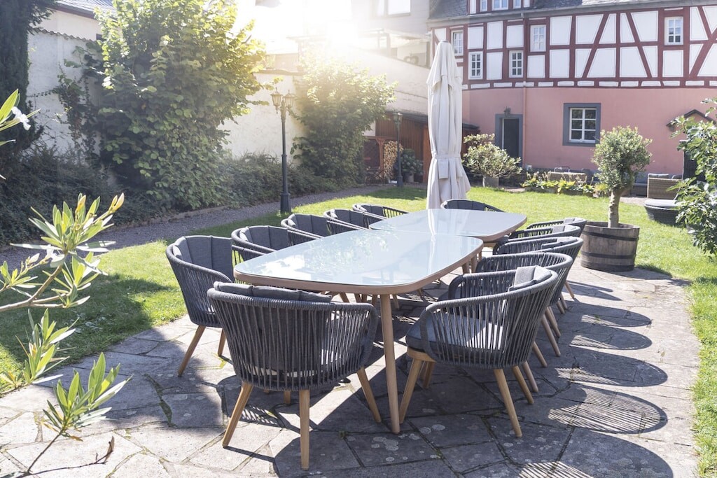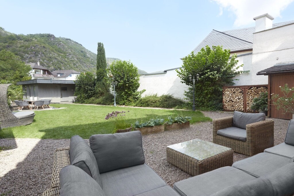 De omheinde, grote tuin van 450 m² is zonovergoten en biedt een vrij uitzicht op de wijngaarden.