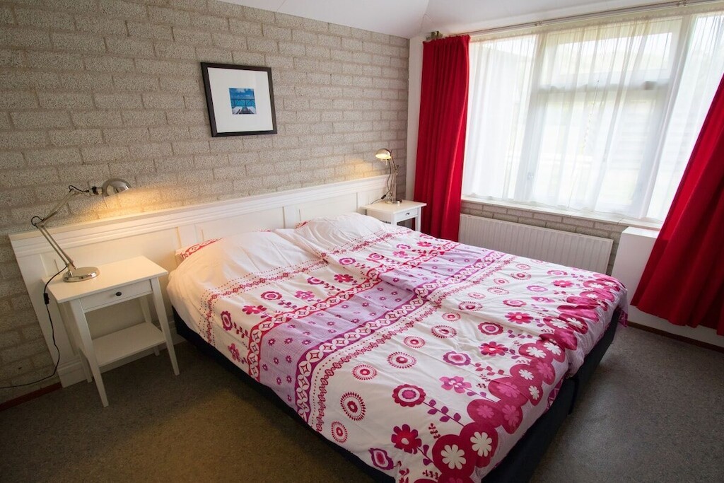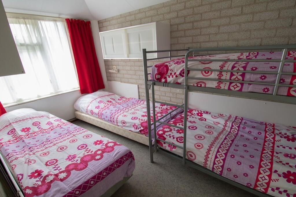 1 slaapkamer met twee eenpersoonsbedden en een stapelbed, 1 slaapkamer met een tweepersoonsbed (2 eenpersoonsbedden), beide slaapkamers hebben een wastafel, wasmachine