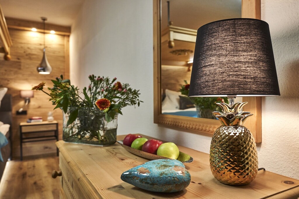 Ons Enzian-vakantieappartement is modern en van hoge kwaliteit, woonoppervlak ca. 100 m² voor 2 personen, open haard, hemelbed, balkon met uitzicht op de tuin