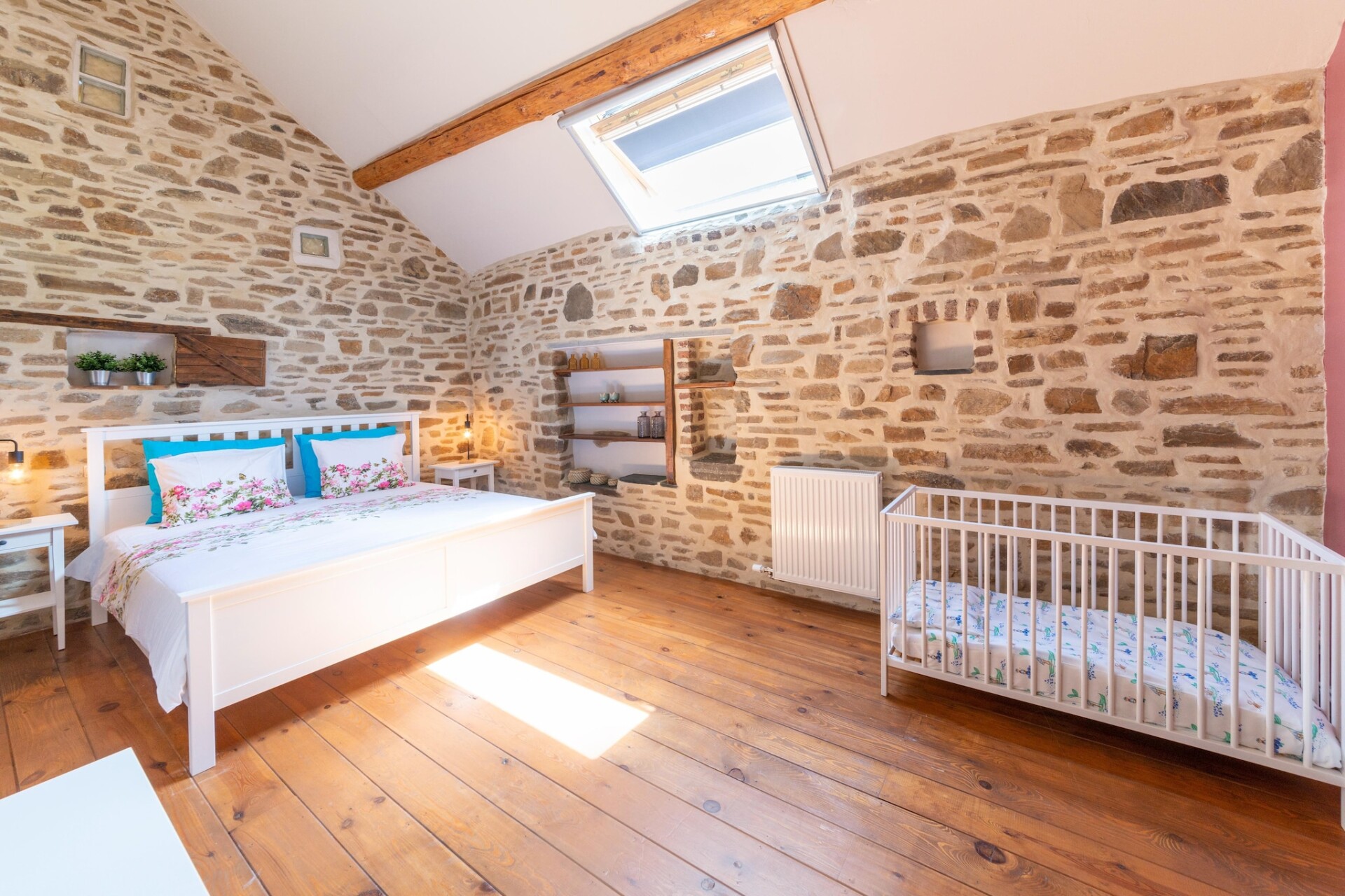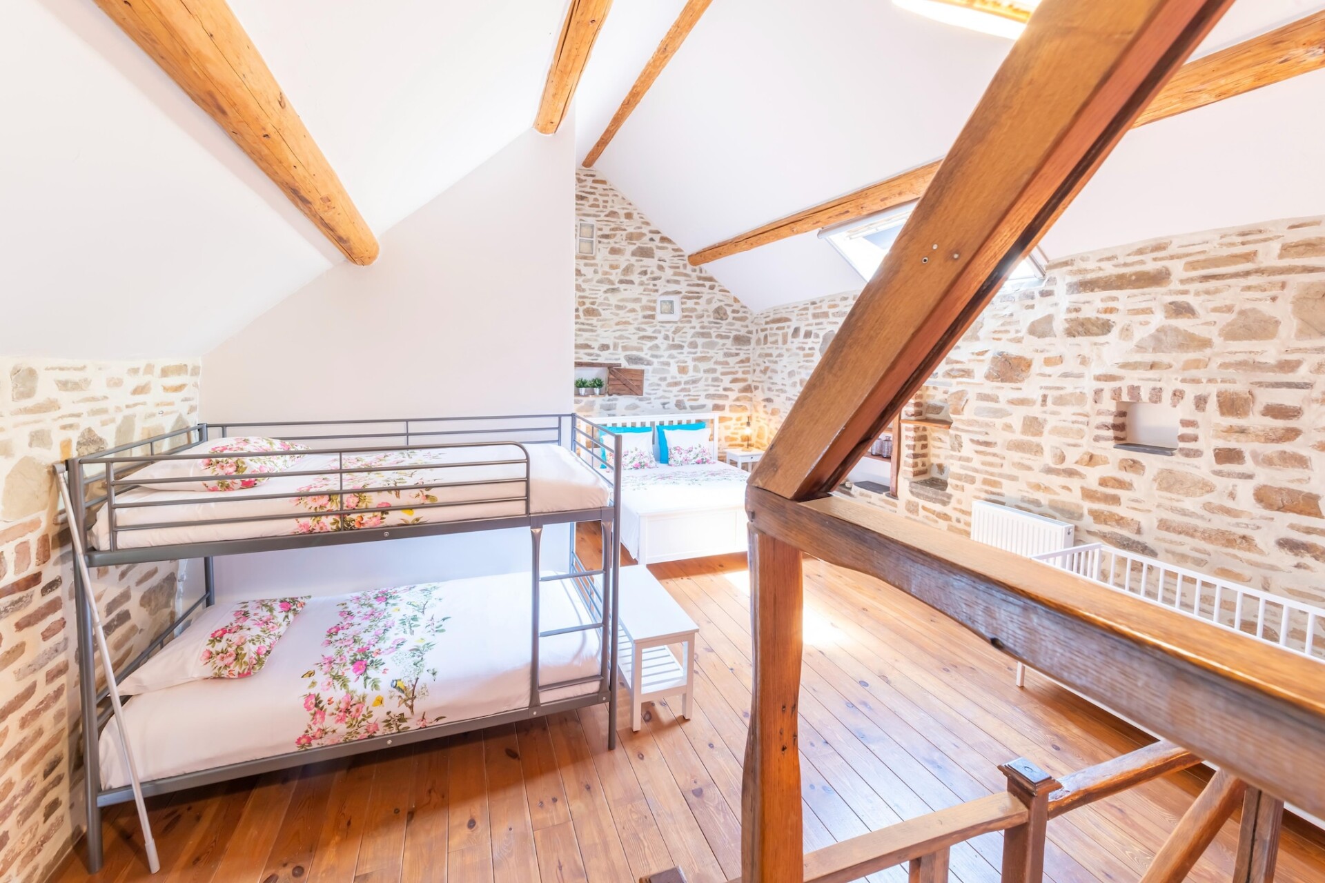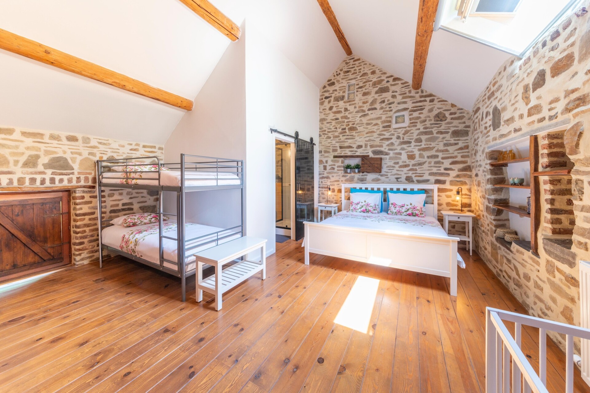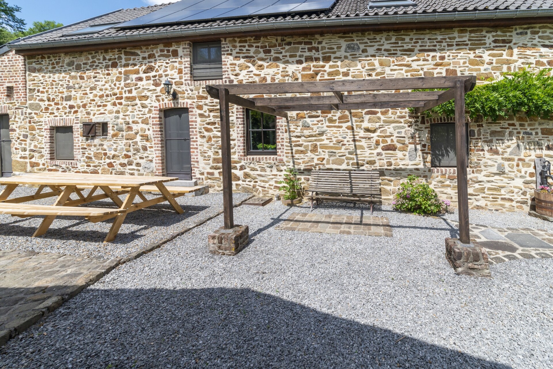 Binnen vindt u een warme woonkamer met open haard, een goed uitgeruste keuken en twee badkamers voor extra comfort. Op de begane grond bevinden zich comfortabele slaapkamers, terwijl de begane grond perfect is om samen te komen en te koken. Een kleine vijver draagt bij aan de charme van de buitenruimte en er is gratis parkeergelegenheid op het terrein.