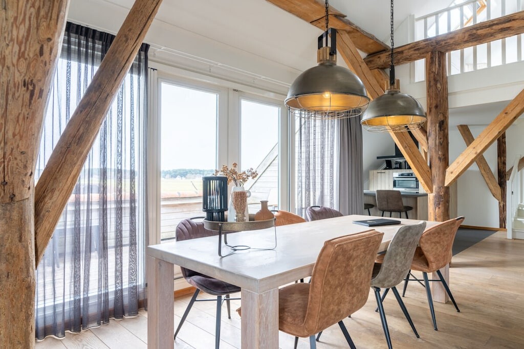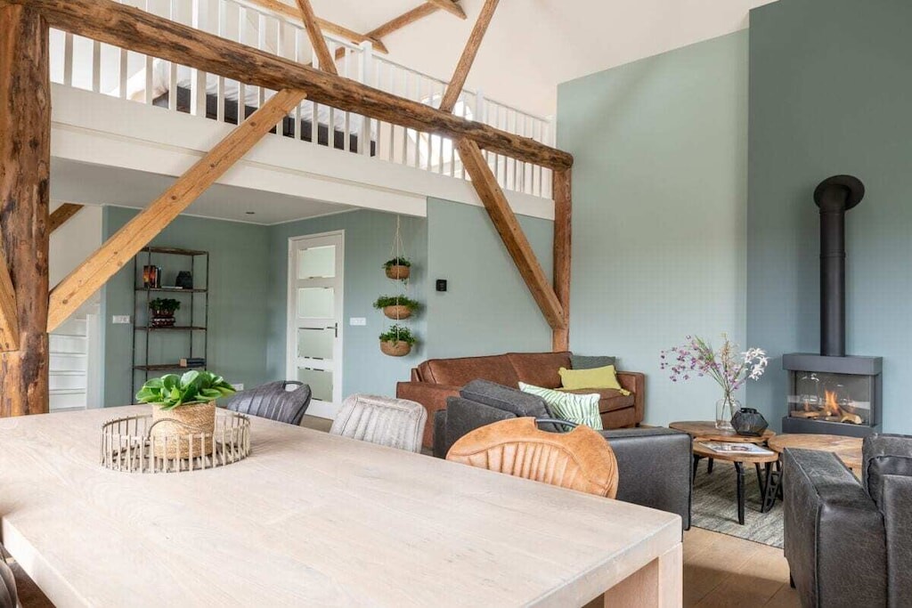 Op de eerste verdieping bevindt zich een ruime woonkamer met prachtige, authentieke details. Het is een heerlijke plek om te ontspannen bij de open haard, een gevoel dat nog versterkt wordt door het mooie uitzicht. De ruime keuken is volledig uitgerust. Op deze verdieping bevindt zich ook een apart toilet.