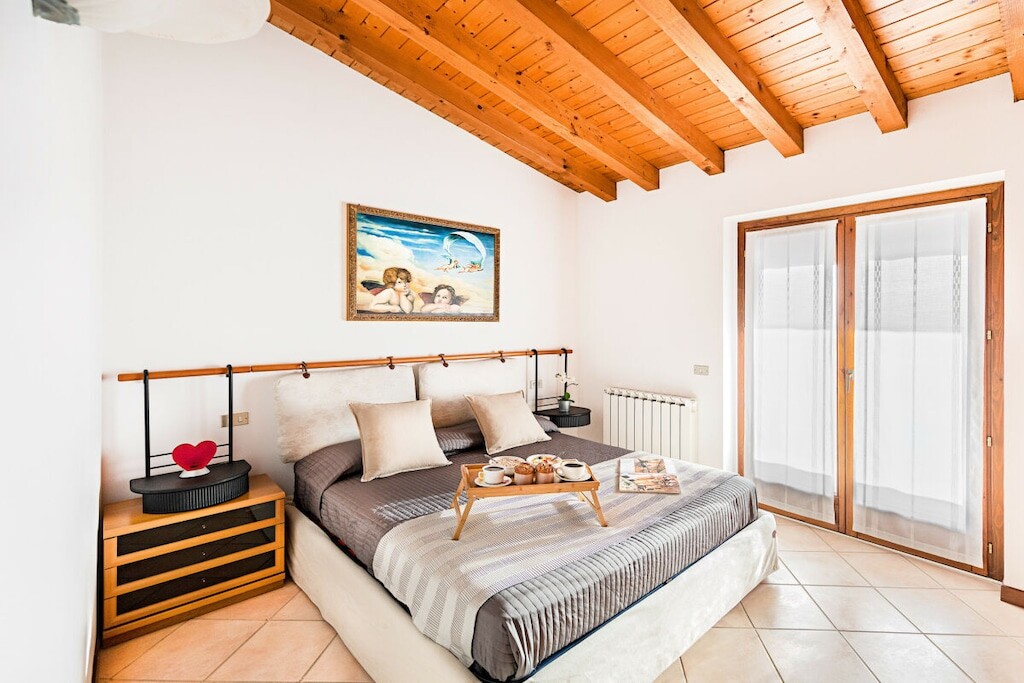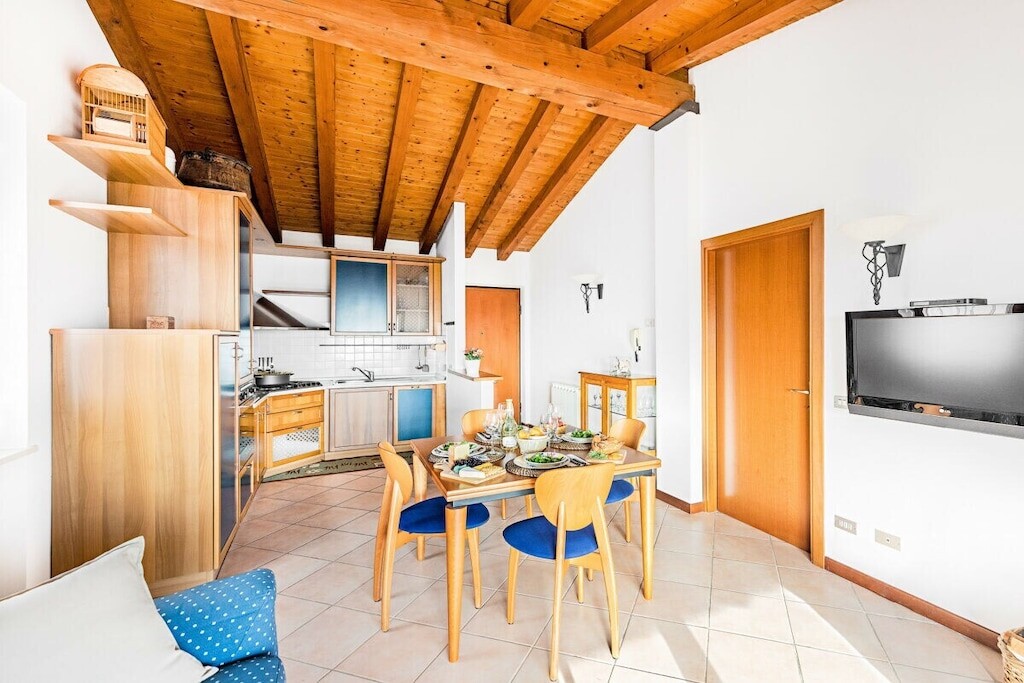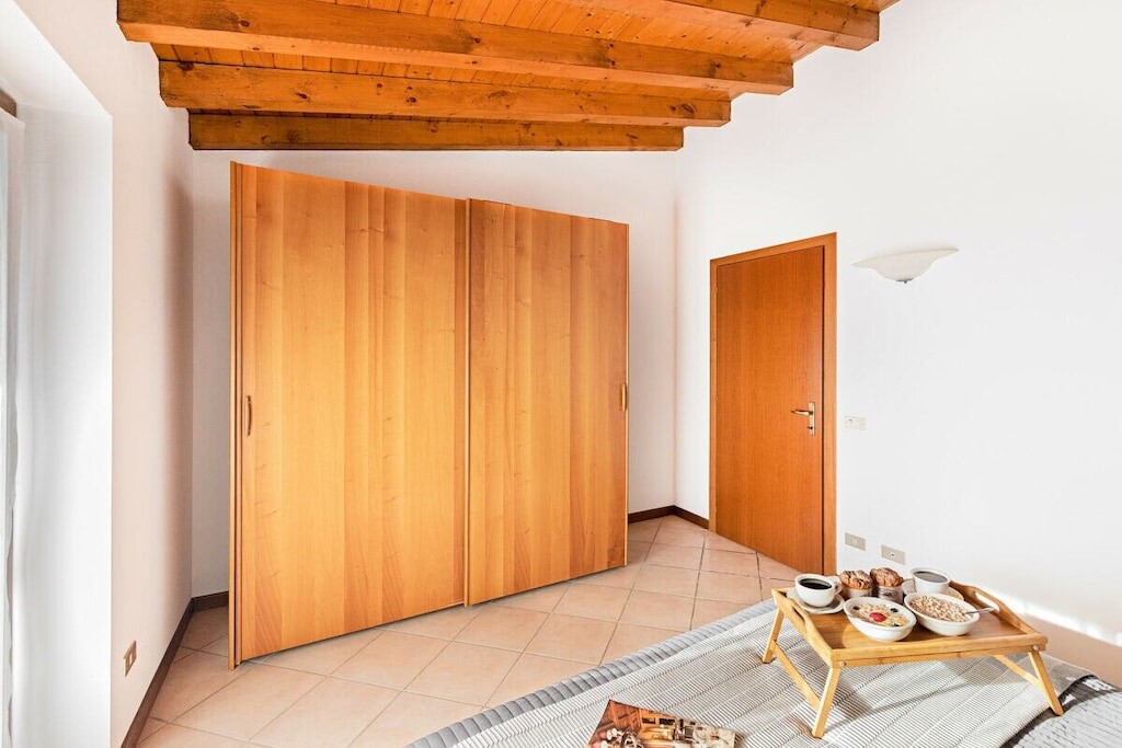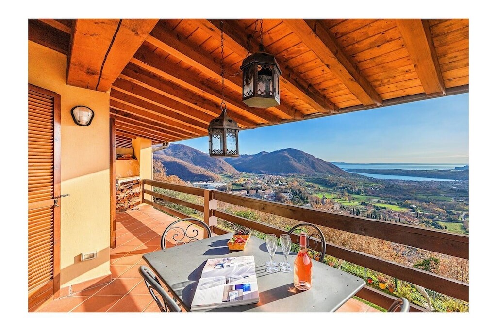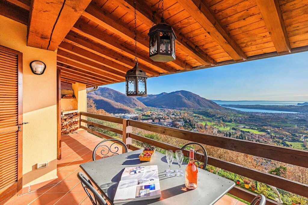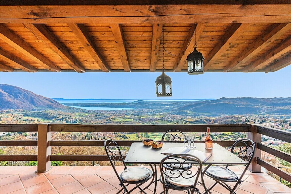 Vanuit de woonkamer heeft u toegang tot het overdekte privéterras met tafel en stoelen om buiten te ontbijten en lunchen met een prachtig uitzicht op het Gardameer en de heuvels!
