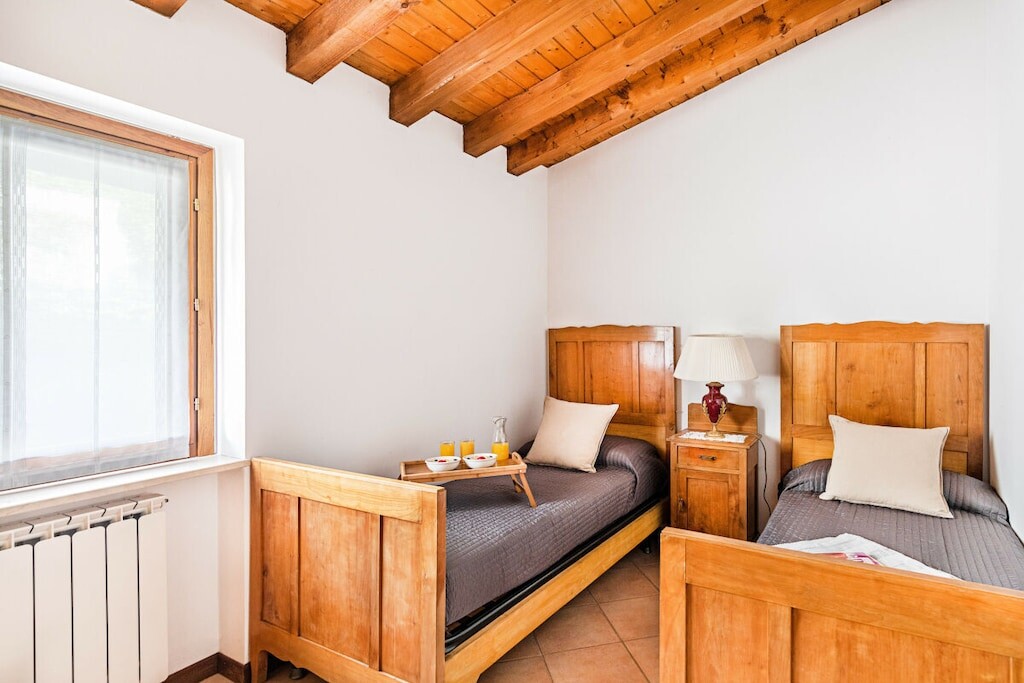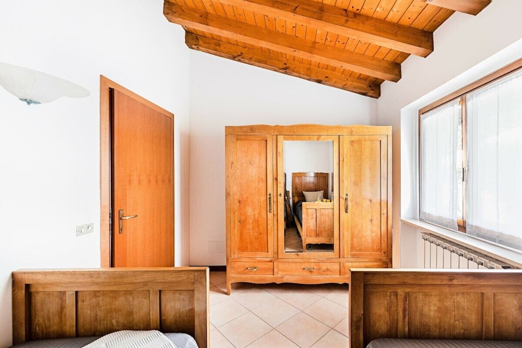 Het appartement gaat verder met de hoofdslaapkamer, voorzien van een comfortabel tweepersoonsbed, een kast en toegang tot het privéterras; de tweede slaapkamer is ingericht met twee eenpersoonsbedden en een kledingkast en heeft toegang tot de privétuin aan de achterzijde.