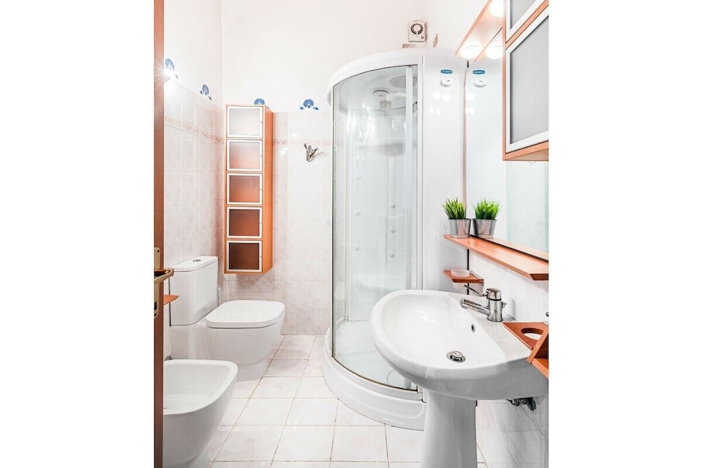 De inrichting van dit vakantieappartement wordt compleet gemaakt door de badkamer met douche, wastafel, bidet en toilet.