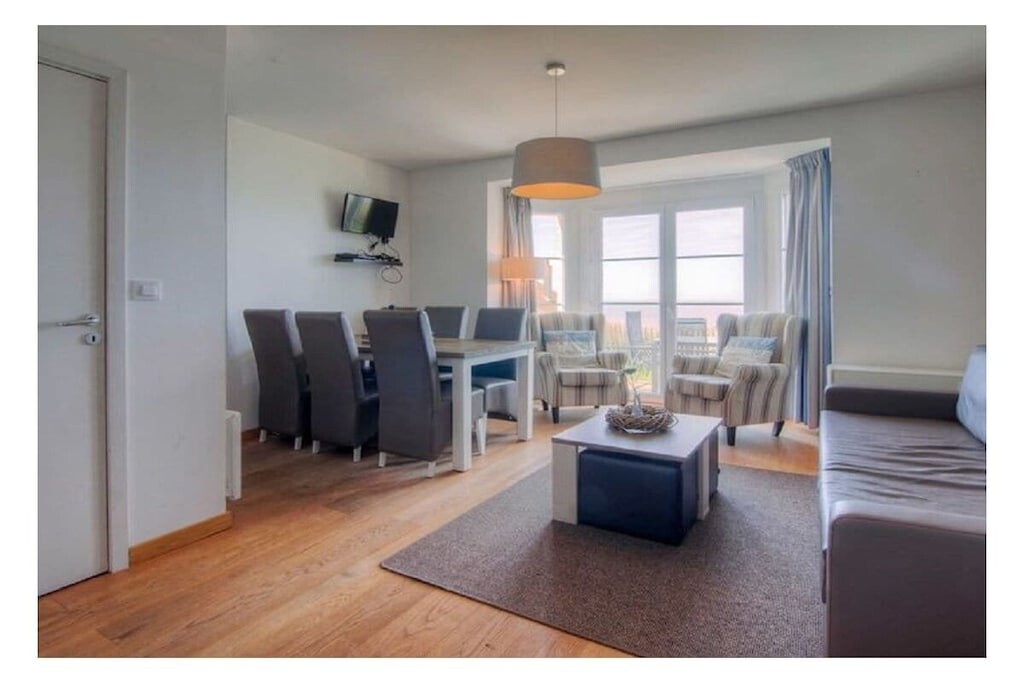 Het vakantiehuis beschikt over een lichte en stijlvol ingerichte woonkamer met eettafel.