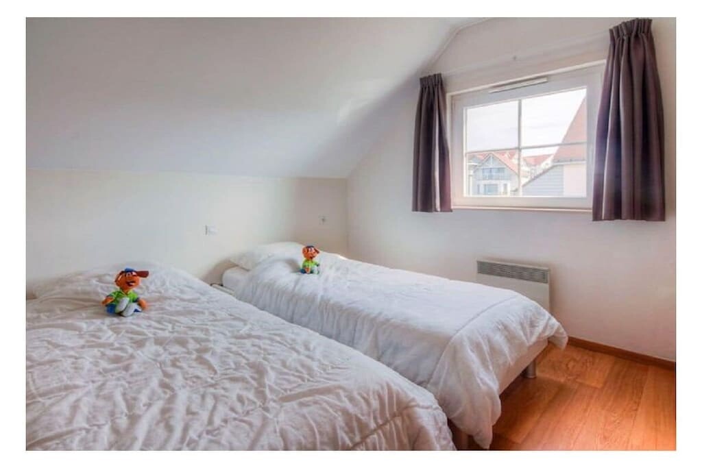 Er zijn twee comfortabele slaapkamers, één met een tweepersoonsbed en één met twee eenpersoonsbedden en een stapelbed.
