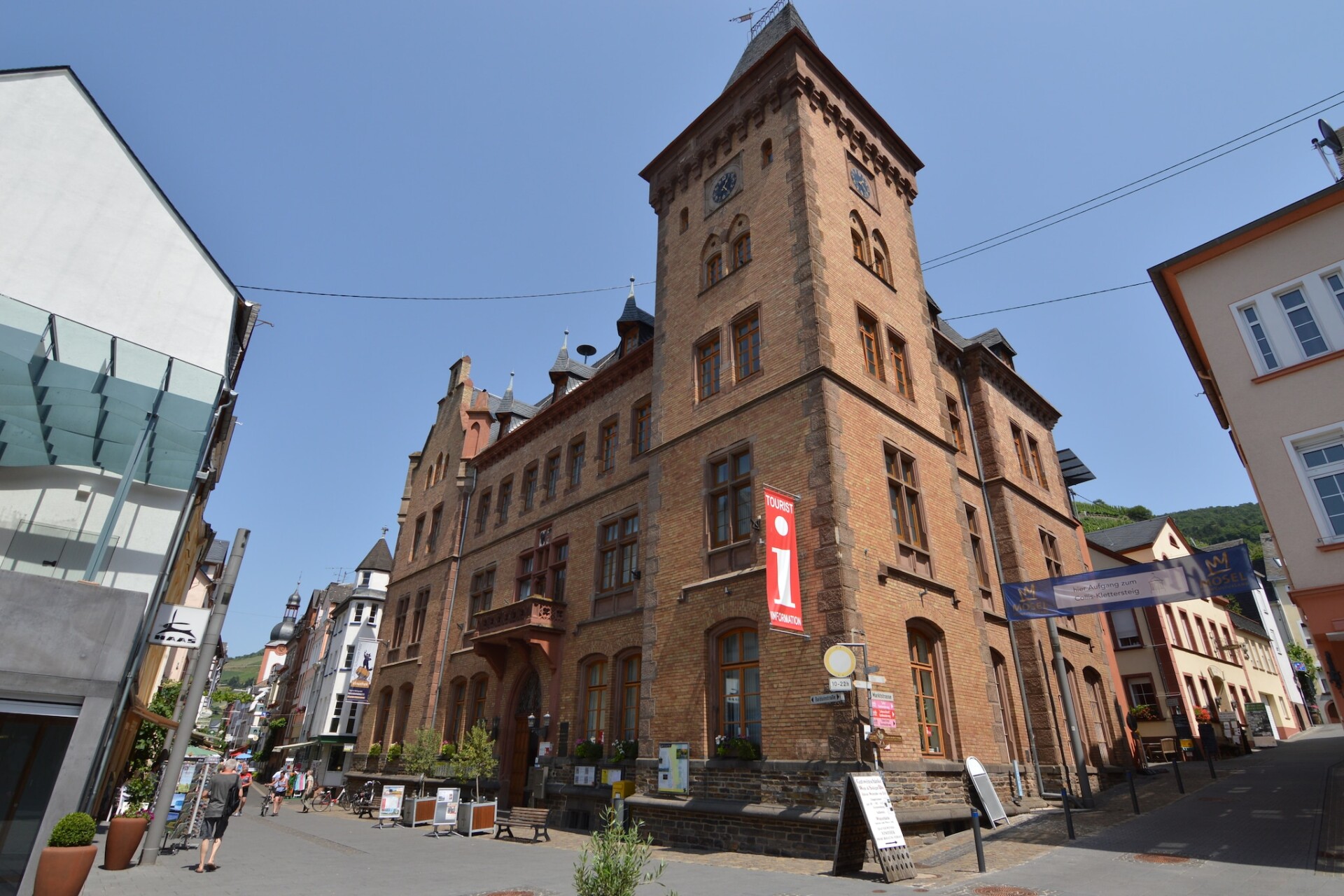 Wanneer je de voordeur van dit appartement uit wandelt, ben je na 30 meter in de gezellige hoofdstraat met talloze winkeltjes. Loop je nog 30 meter verder, onder de poort door, dan sta je op de boulevard. En aan de overkant daarvan: de Moezel. Dichter bij deze welhaast romantische rivier kun je bijna niet zitten! ’s Avonds kun je hier heerlijk eten op één van de vele terrasjes terwijl de zon langzaam achter de tegenoverliggende heuvels verdwijnt. Op die heuvels zie je de wijnvelden liggen waar de bekende wijn gemaakt wordt die je overal in Zell kunt kopen: Schwarze Katz. Dit dier is sinds jaar en dag het symbool van het plaatsje, zoals ook blijkt uit zijn aanwezigheid op het centrale plein.
