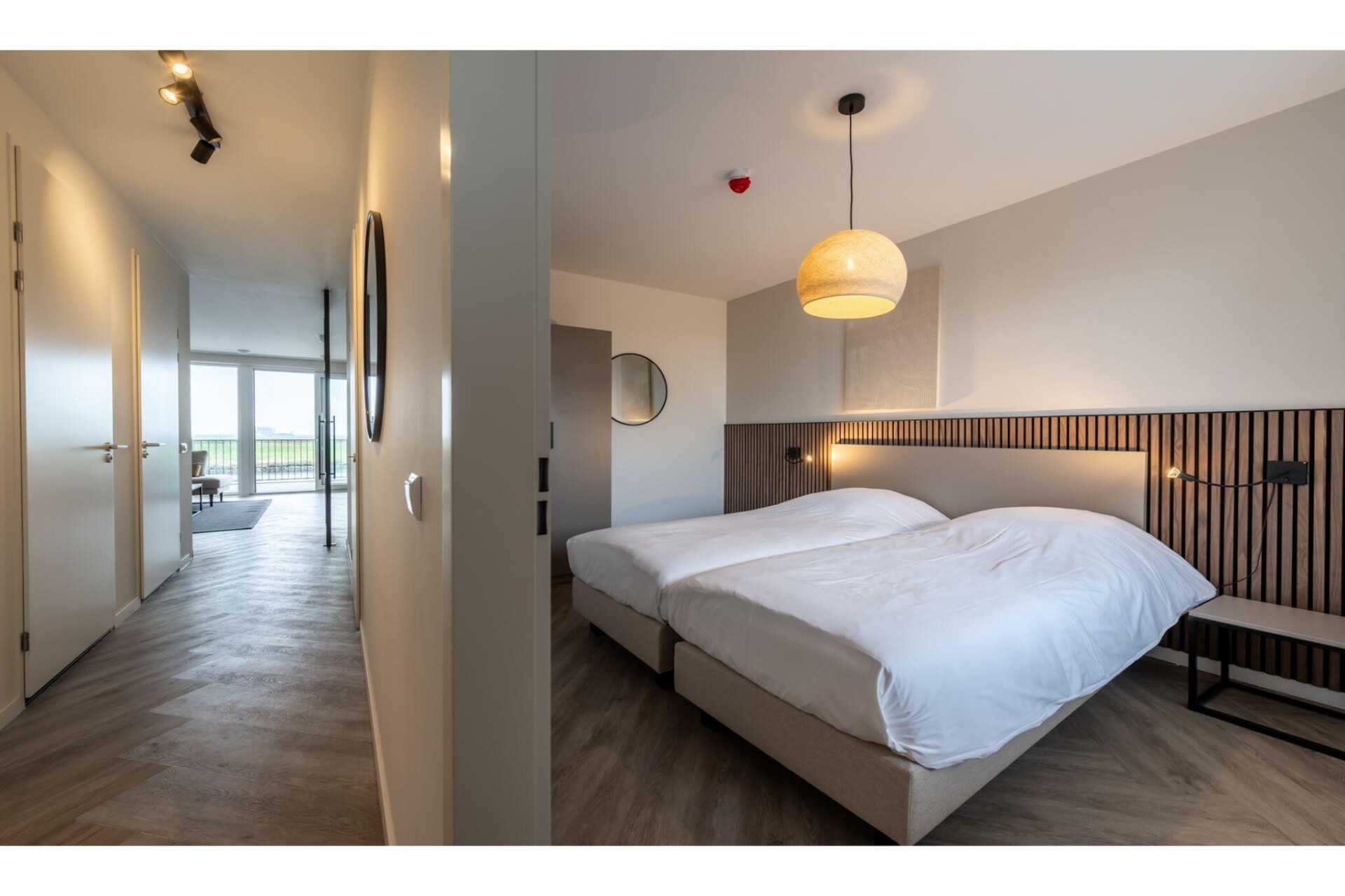 Dit appartement is gelegen op de eerste etage en is ingericht voor 4 personen. De entree biedt toegang tot twee slaapkamers met lits-jumeaux, waarvan één slaapkamer met tv. Bij aankomst zorgen wij dat de bedden fris voor u zijn opgemaakt. De moderne badkamer is uitgerust met een inloopdouche en dubbele wastafel. Er is een apart toilet in de gang.