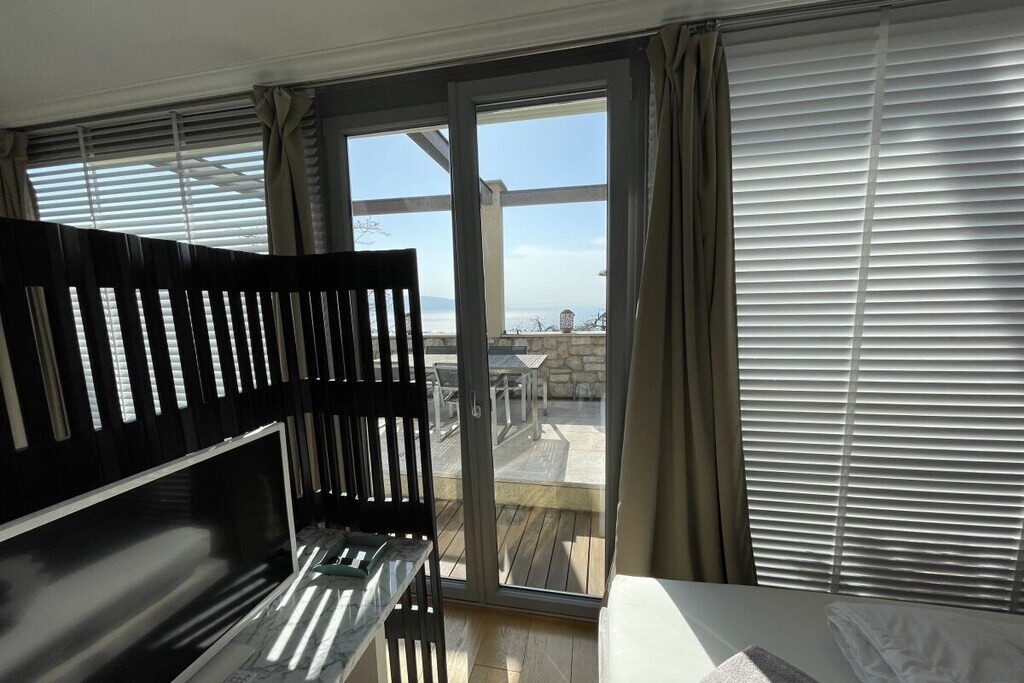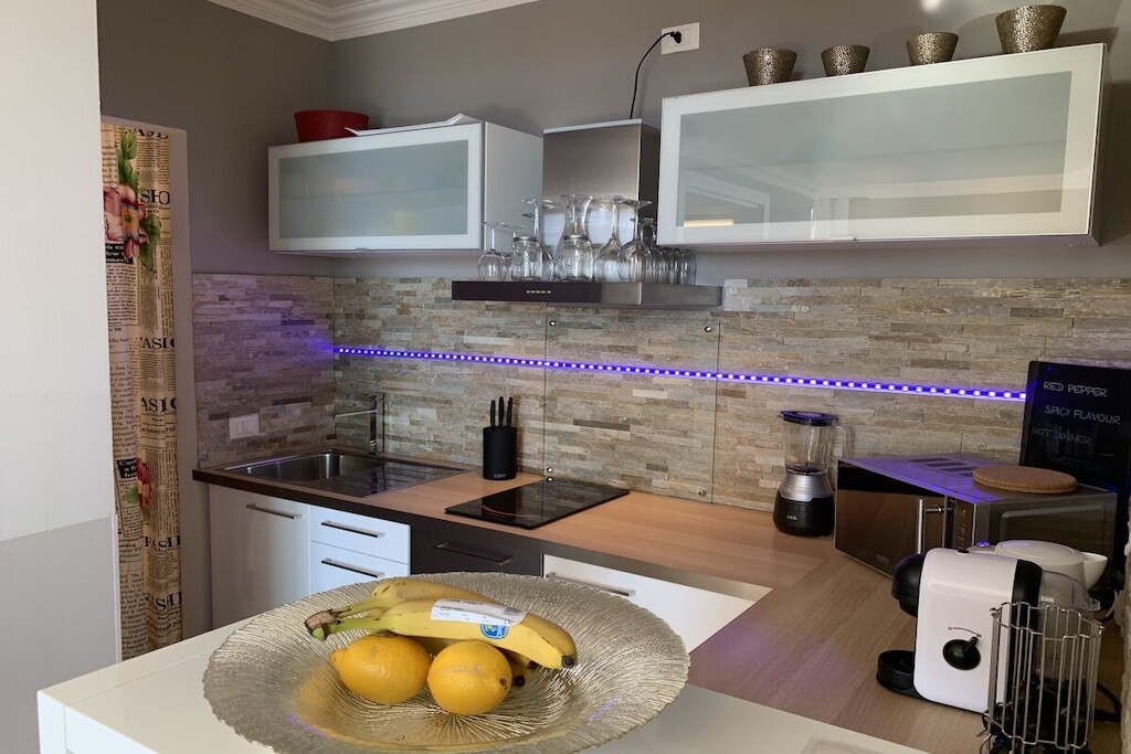 Vakantieappartement 1 Maderno beschikt over een grote slaapkamer met een kledingkast, een tweepersoonsbed van 160 x 200 cm, een terras met uitzicht op het meer en een smart-tv, evenals een tweede slaapkamer met een tweepersoonsbed van 160 x 200 cm en een smart-tv. Het vakantieappartement is gelegen in een hoogwaardig, architectonisch uitzonderlijk en modern complex in de stijl van een limonaia in Toscolano-Maderno, op een heuvel, te midden van een olijfgaard.