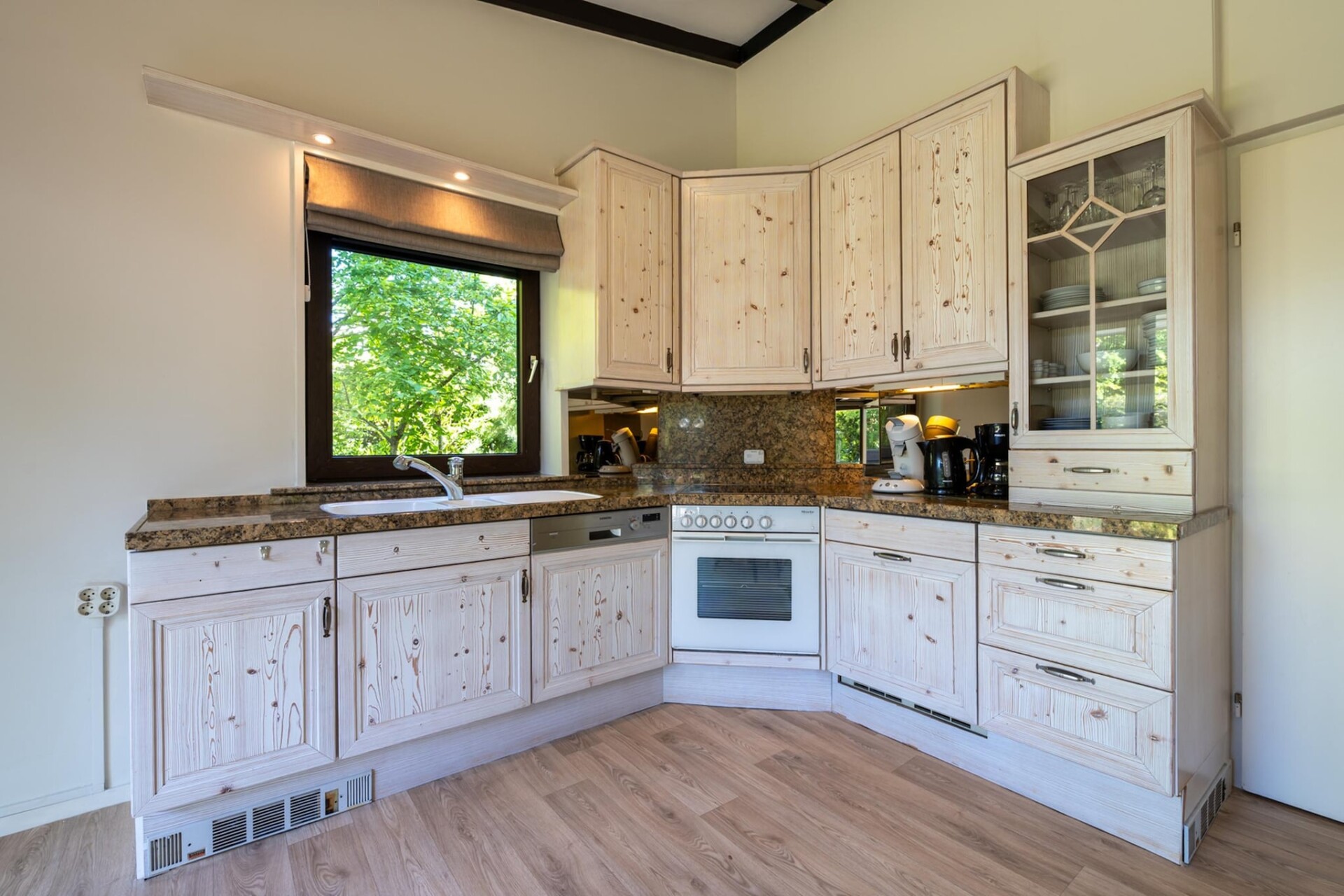 De entree van de woning biedt toegang tot de woonkamer met open keuken en een slaapkamer met twee boxspringbedden en een badkamer ensuite met een ruime douche, wastafel en toilet. Op de verdieping zijn twee slaapkamers. Een slaapkamer met drie éénpersoons boxspringbedden en een slaapkamer met een lits-jumeaux. Er is een ruime badkamer met bad, wastafel en toilet. In de hal is een apart gastentoilet. De riante woonkamer is voorzien van een flatscreen met digitale smart tv en openslaande deuren naar het zonnige terras. De ruime open keuken is voorzien van comfort inbouwapparatuur, o.a. een oven/grill, een koel/vriescombinatie , een vaatwasser. In de garage is een wasmachine en een wasdroger en een extra koel-vriescombinatie .