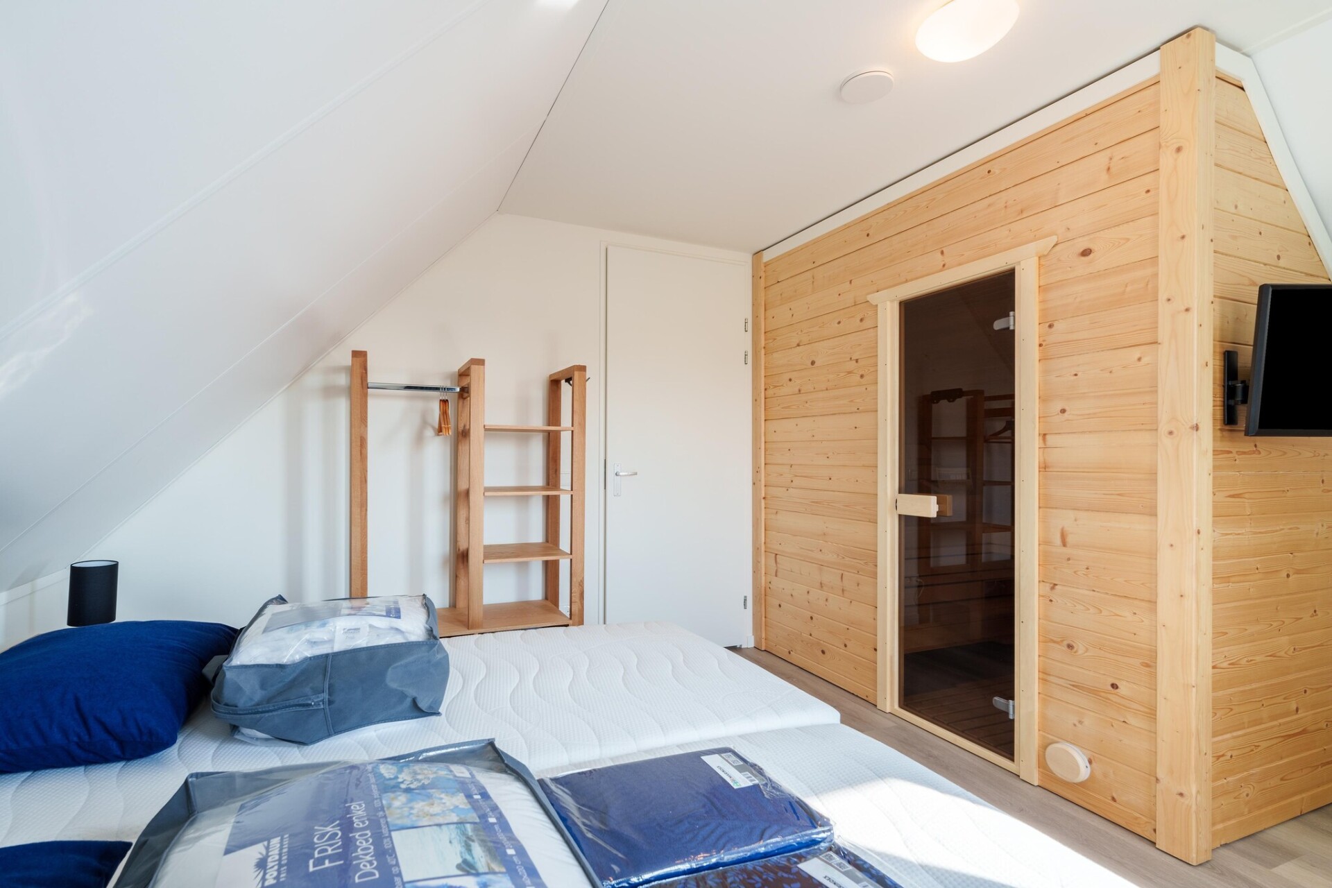 Binnen combineert comfort met gemak met een gezellige woonkamer met tv, een moderne open keuken met essentiële apparatuur en twee uitnodigende slaapkamers met eenpersoonsbedden. Gasten kunnen genieten van het privéterras en de tuin, perfect om buiten te ontspannen. Een sauna voegt een vleugje luxe toe, terwijl voorzieningen zoals een wasmachine, tuindeuren en privéparkeergelegenheid zorgen voor een naadloze ervaring.