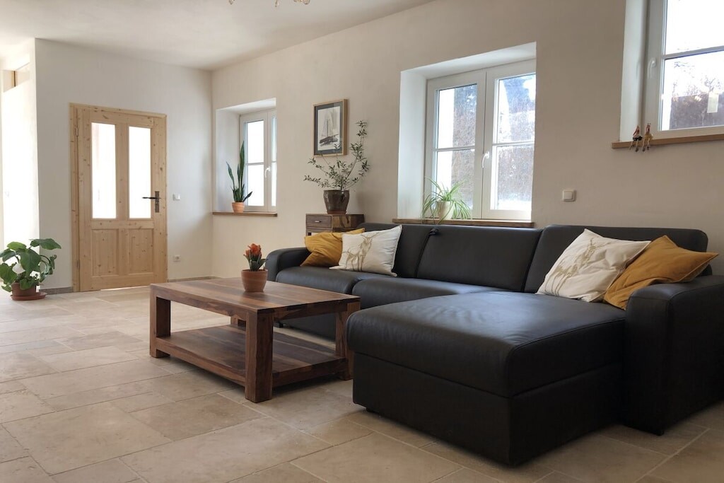 De grote, zonovergoten woonkamer met aparte eethoek nodigt uit om te ontspannen op de comfortabele echt lederen bank. Bij meer dan twee gasten is de bank uitschuifbaar en dankzij een volwaardig matras (140 x 200 cm) snel om te bouwen tot een comfortabel bed.