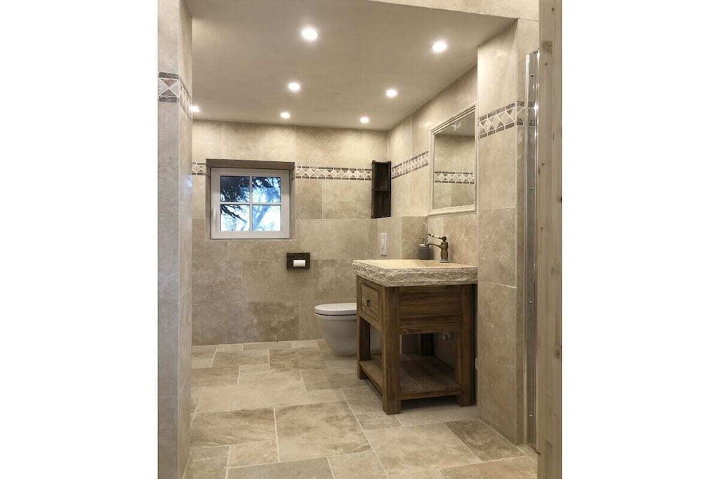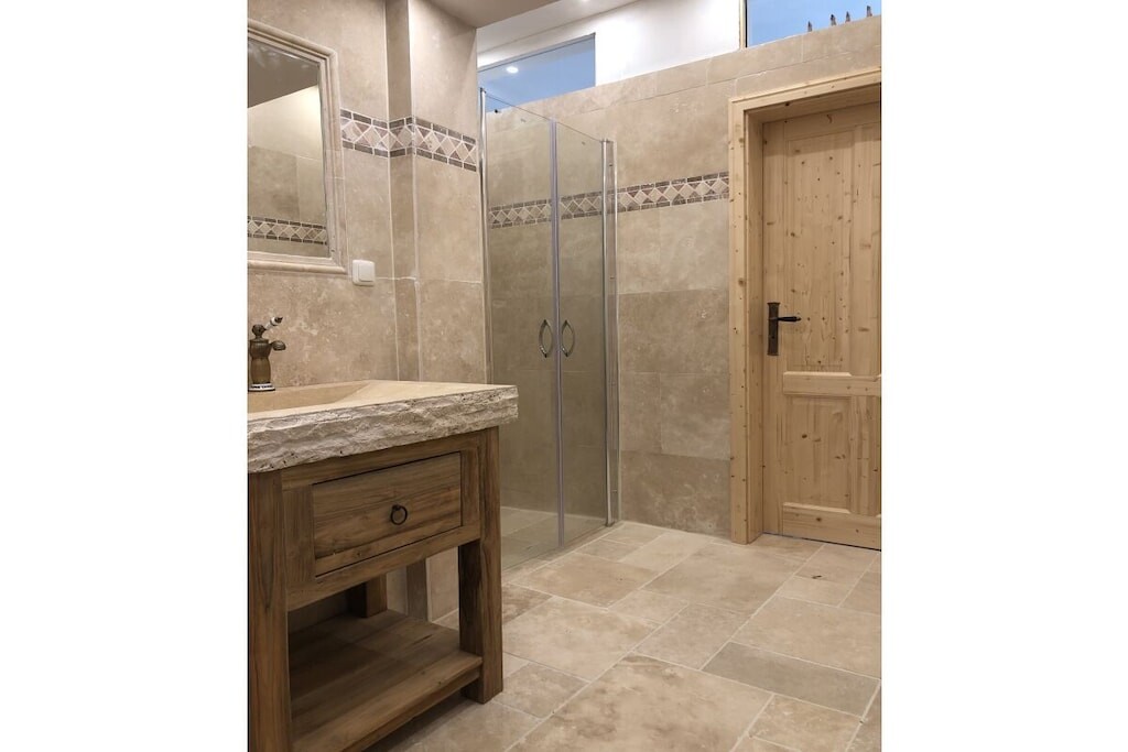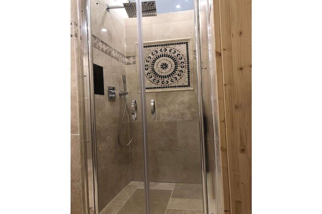De elegante badkamer beschikt onder meer over een inloopdouche.