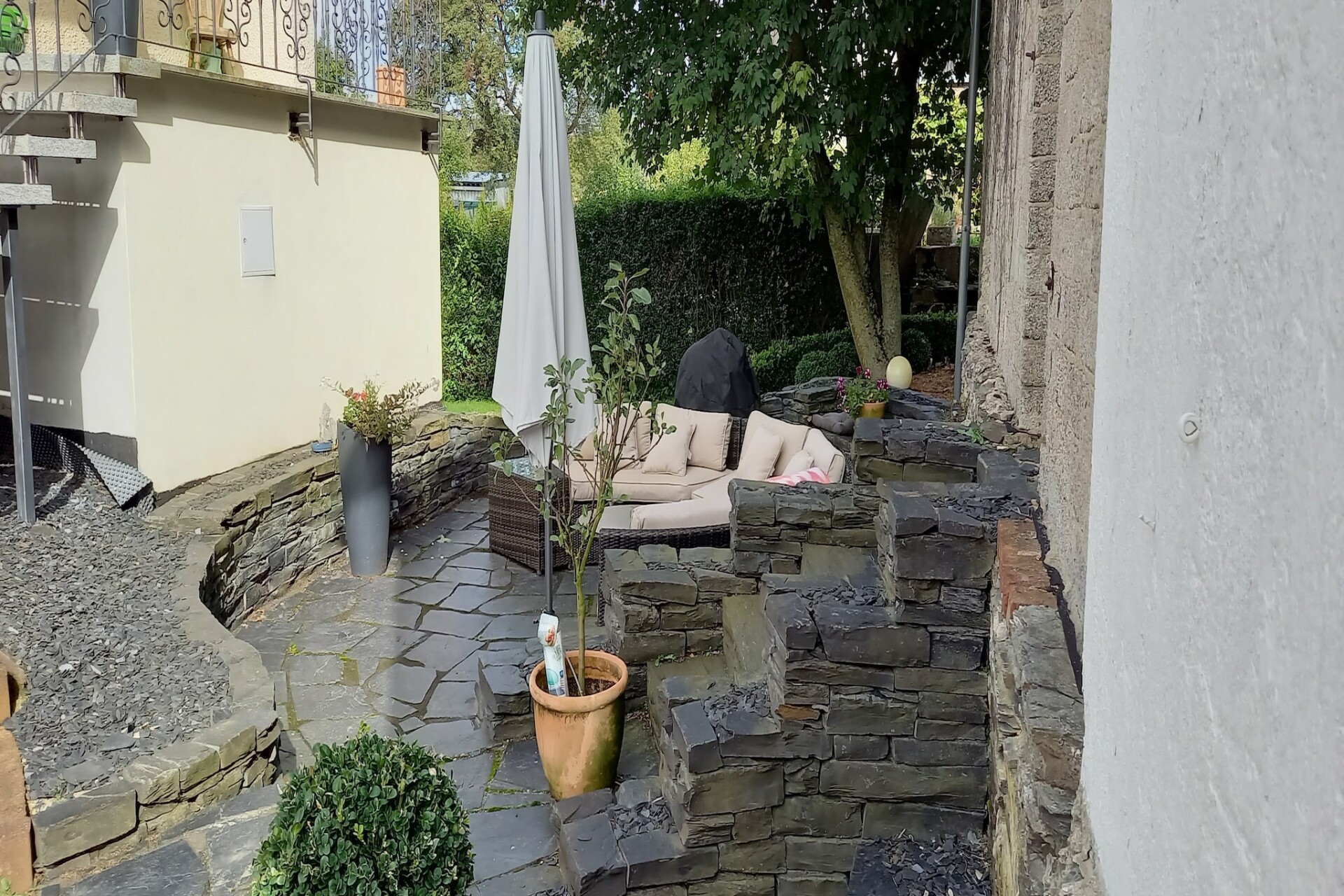 De halfronde lounge tussen het gastenverblijf en de woning van de verhuurder zorgt voor een gezellige, gemeenschappelijke sfeer, terwijl het terras uitnodigt tot barbecues in de avond met een schilderachtig uitzicht op het omliggende landschap.