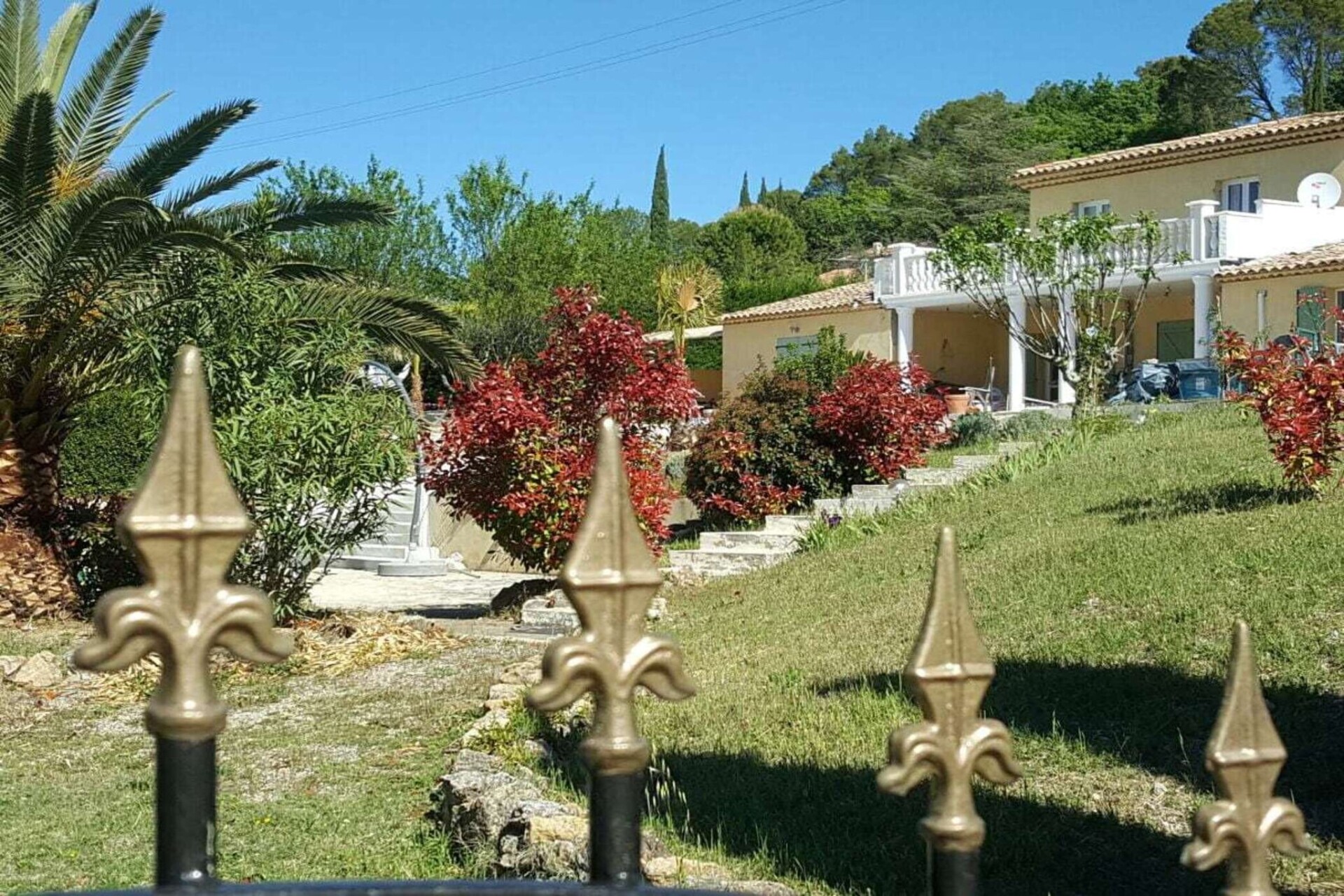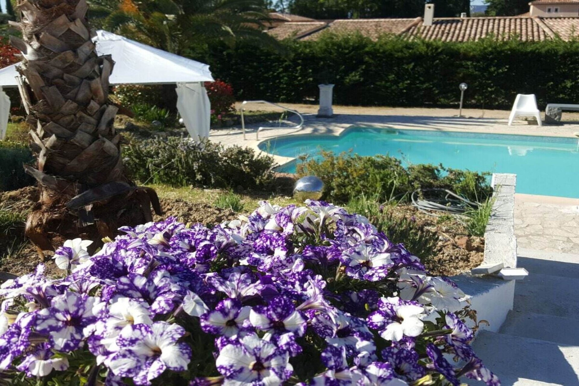 U bevindt zich op een omheind terrein met palmbomen, cipressen, vijgen- en citroenbomen, kleurrijke bloemen, oleanders en oude olijfbomen