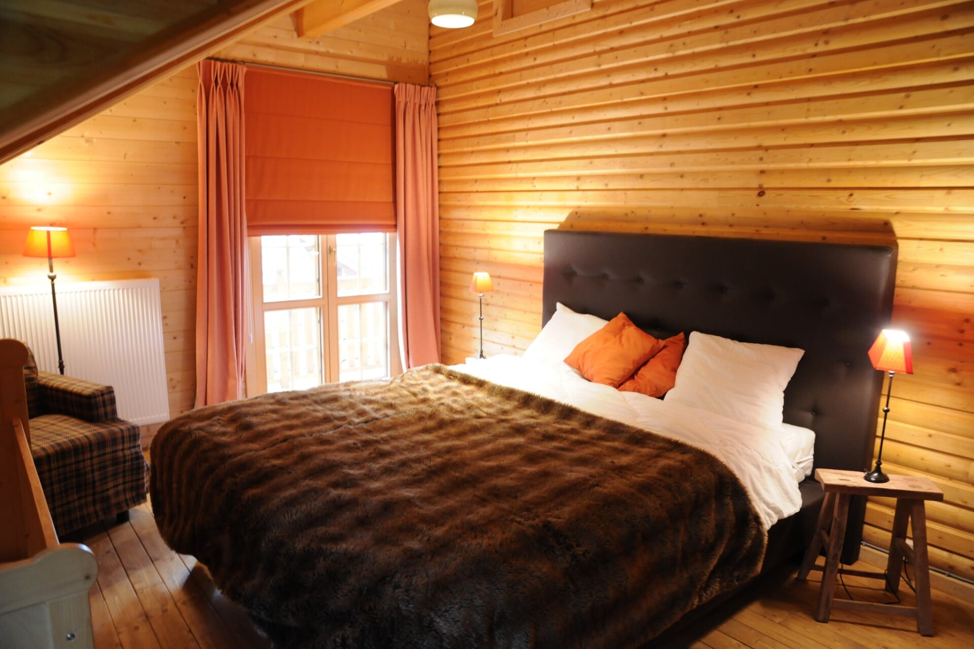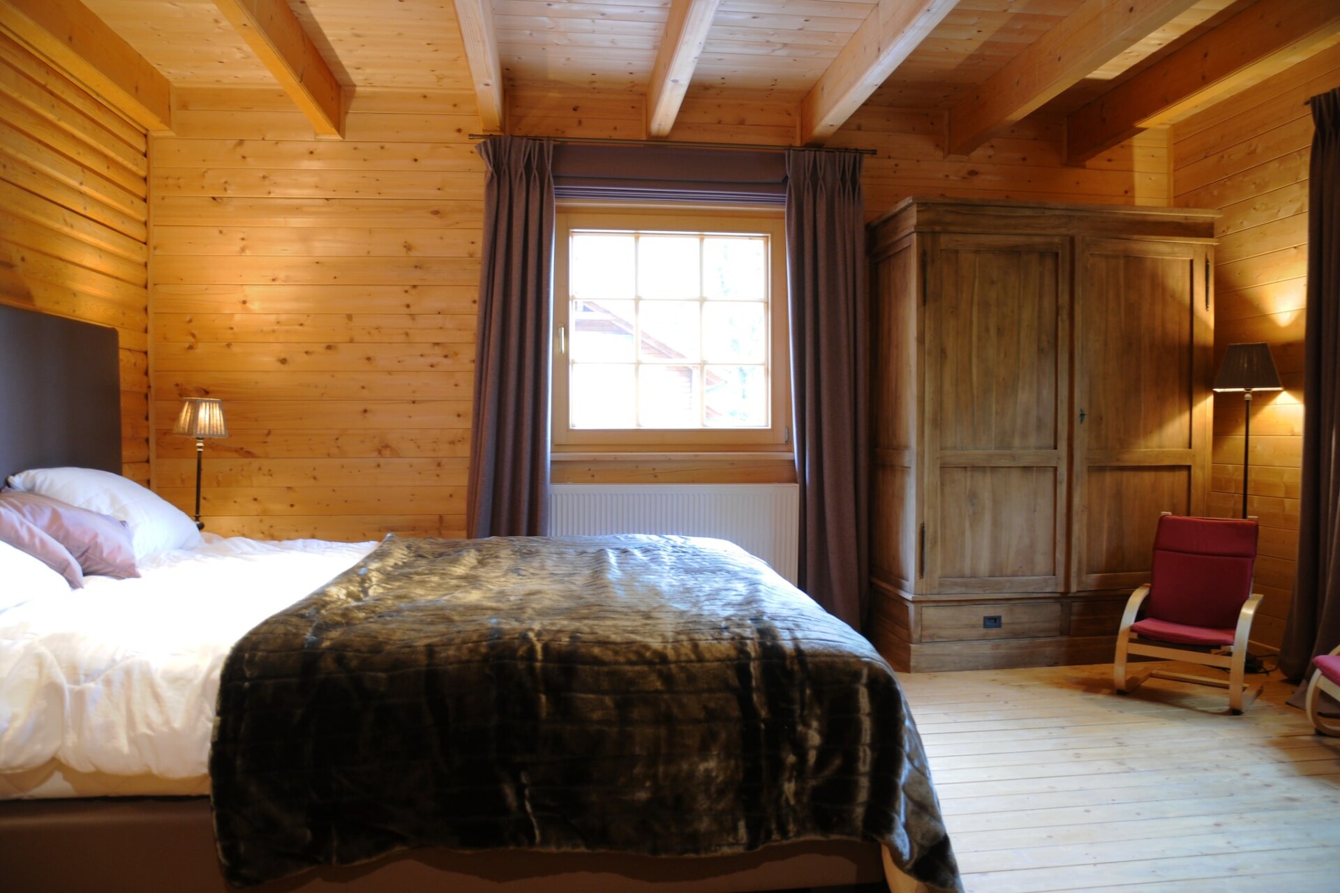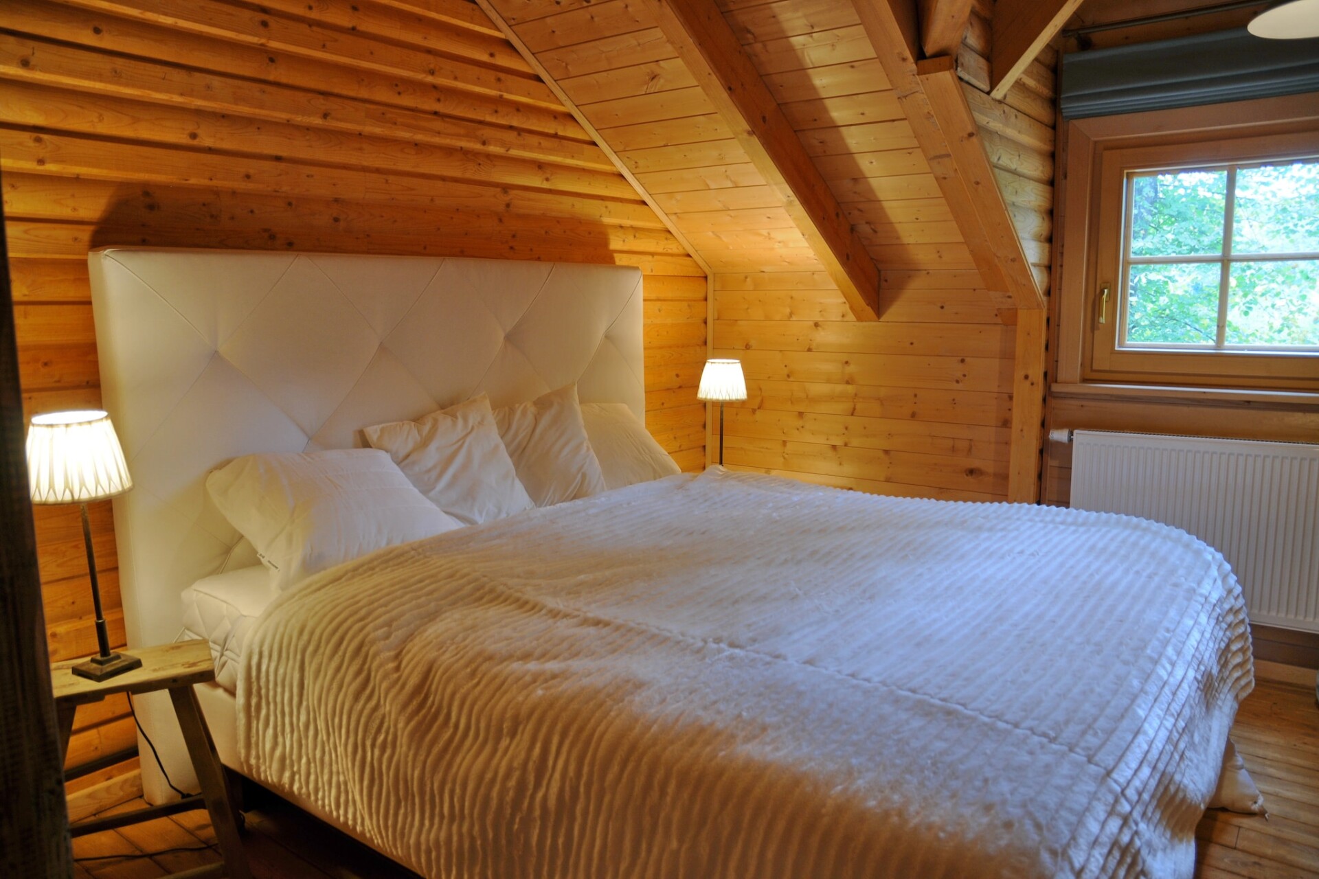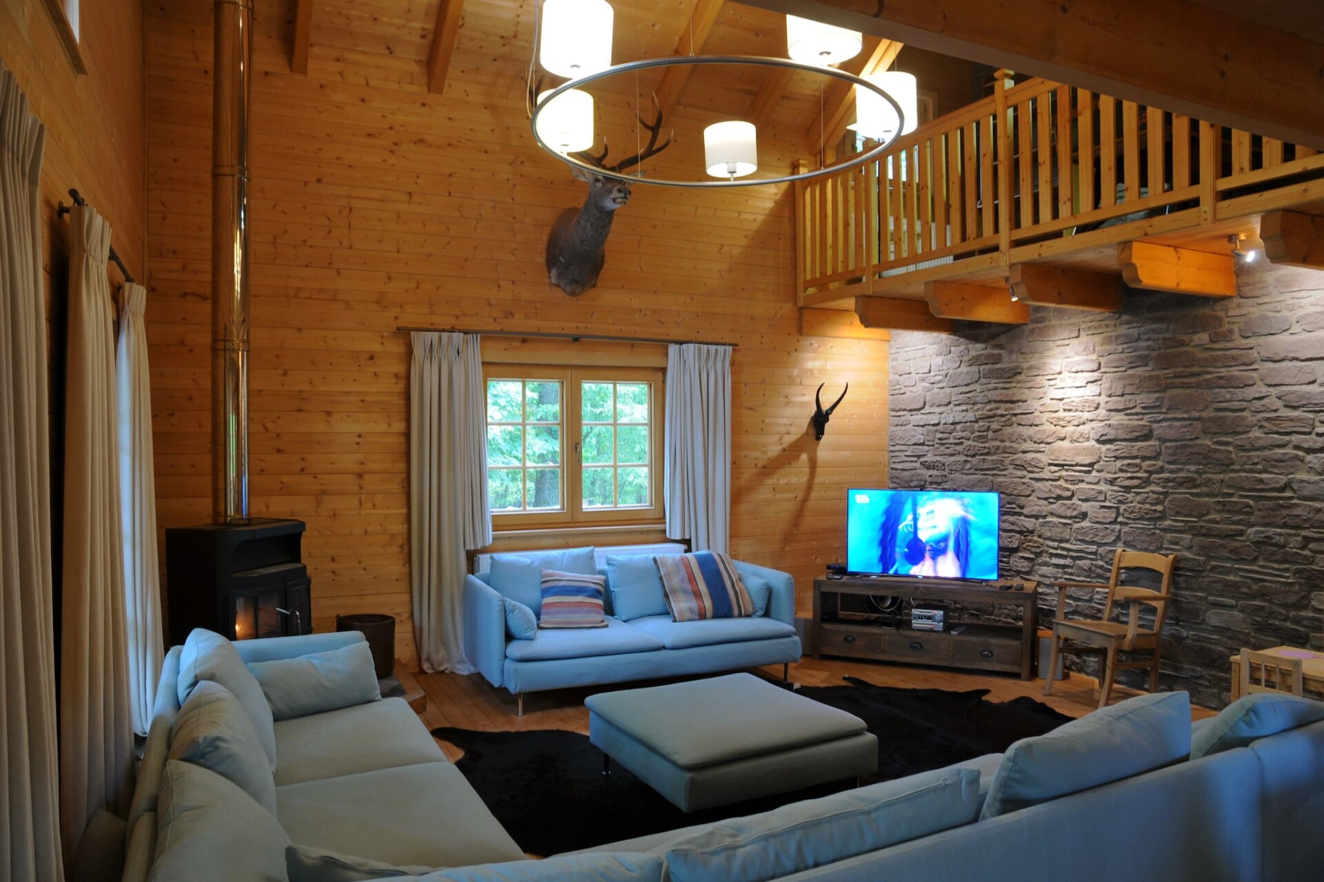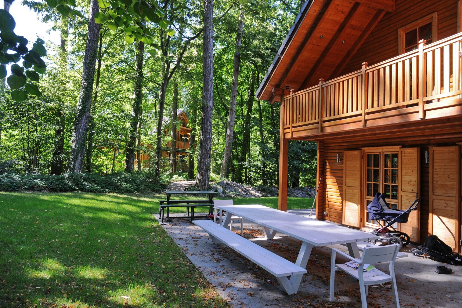 Het chalet heeft een zeer gezellige woonkamer met een houtkachel, een open keuken en een grote eettafel. Je kunt op het terras genieten van de bomen om je heen, terwijl de kinderen zich vermaken in het bijbehorende speeltuintje in de tuin. Ook een tafelvoetbal is aanwezig.
