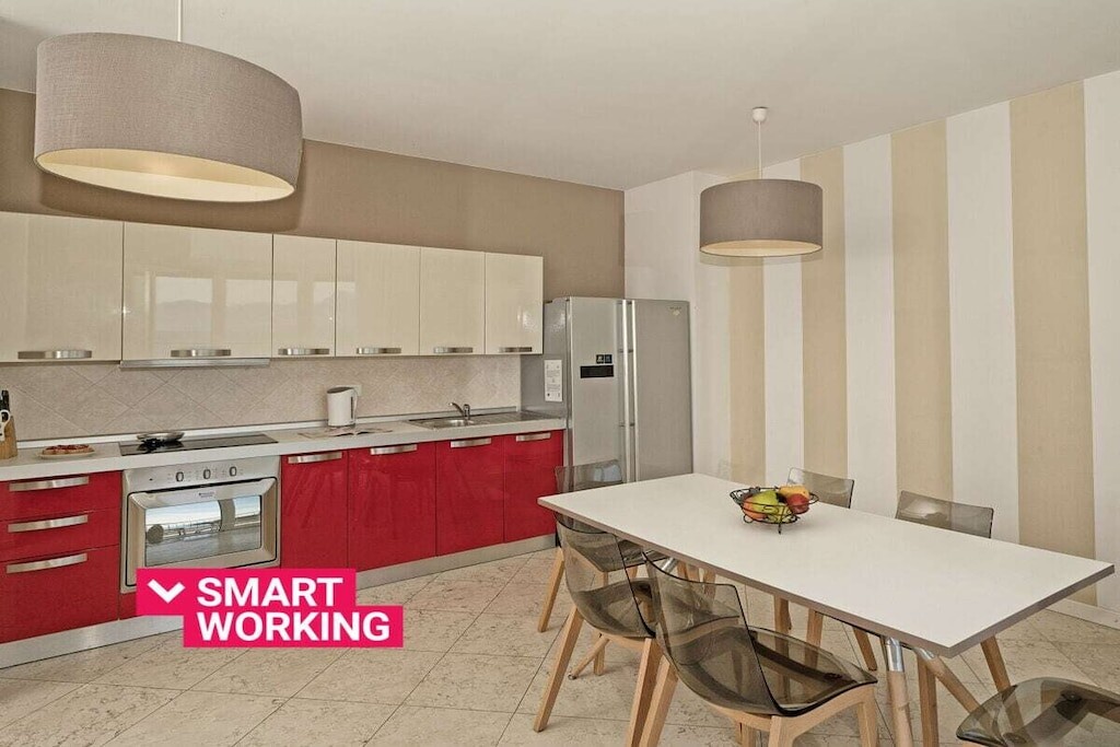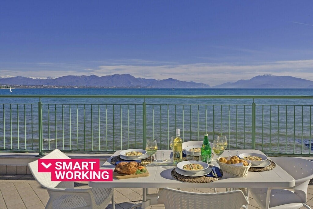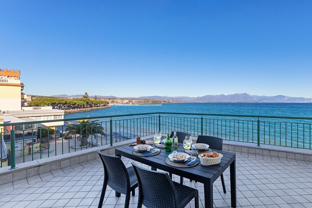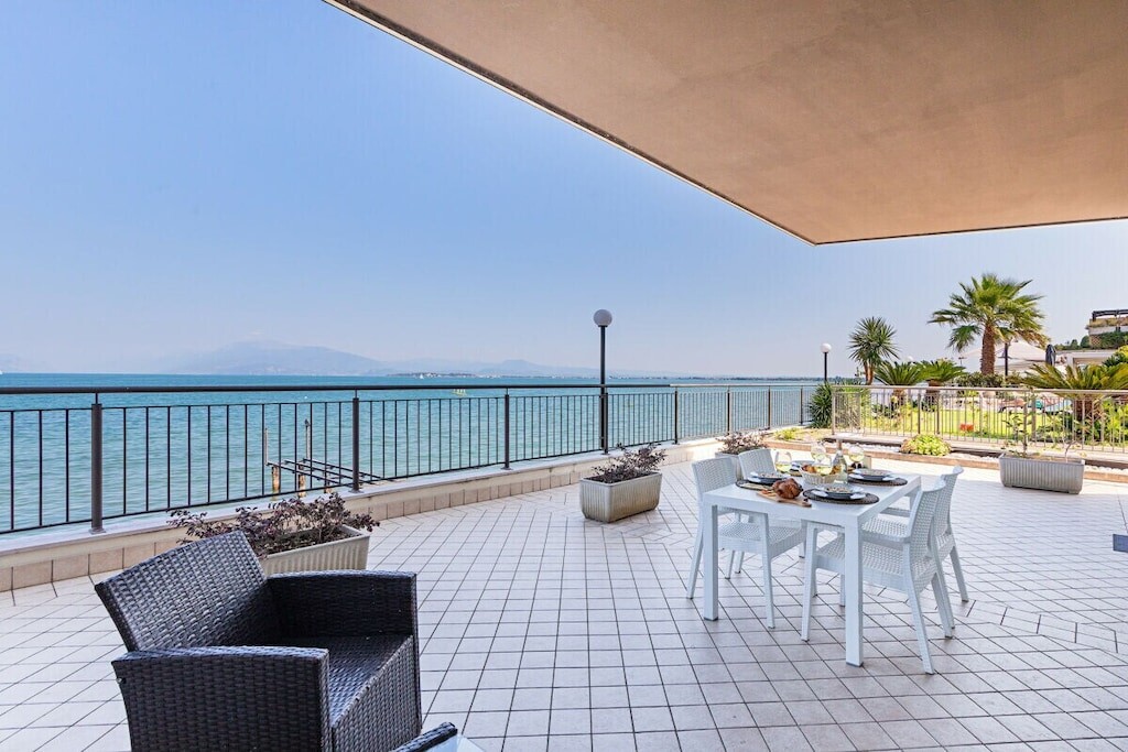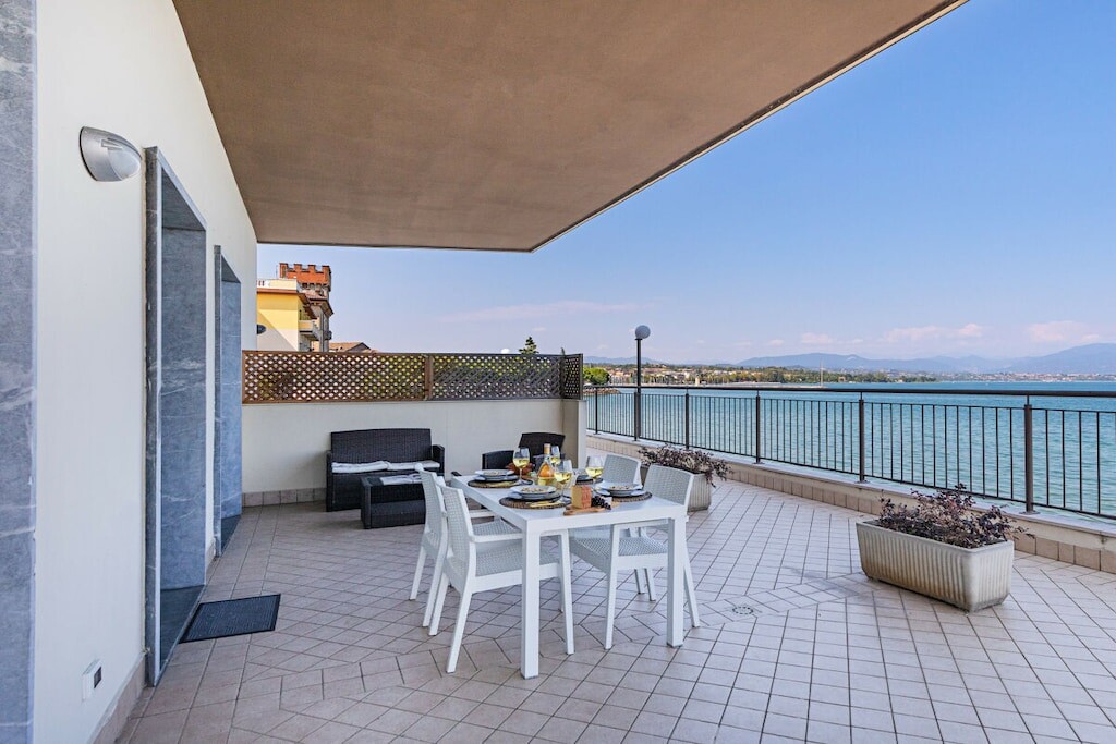 Buiten is er een prachtige ruimte met uitzicht op het meer, uitgerust met een tafel, stoelen, banken en fauteuils en een kleine tafel om te genieten van de kleuren van het Gardameer.