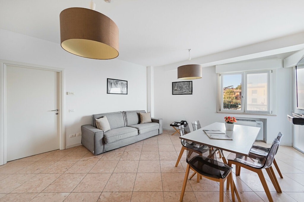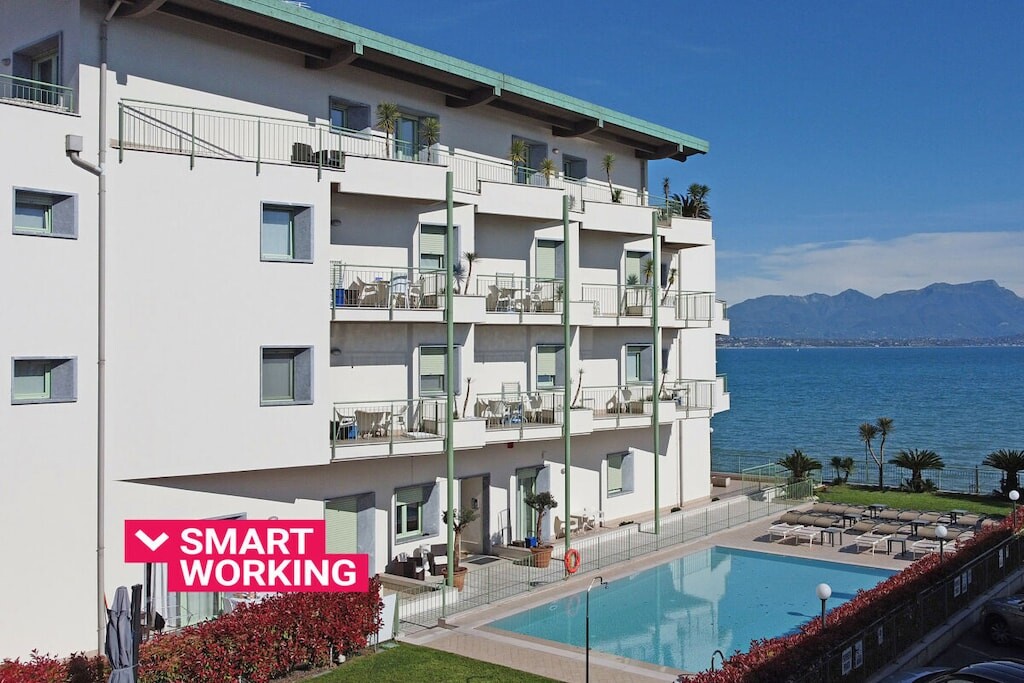 Modern appartement met één slaapkamer en uitzicht op het meer in Residenza Miralago met gedeeld overloopzwembad en tuin, op slechts een steenworp afstand van het centrum van Desenzano del Garda en met directe toegang tot de boulevard en het openbare strand.