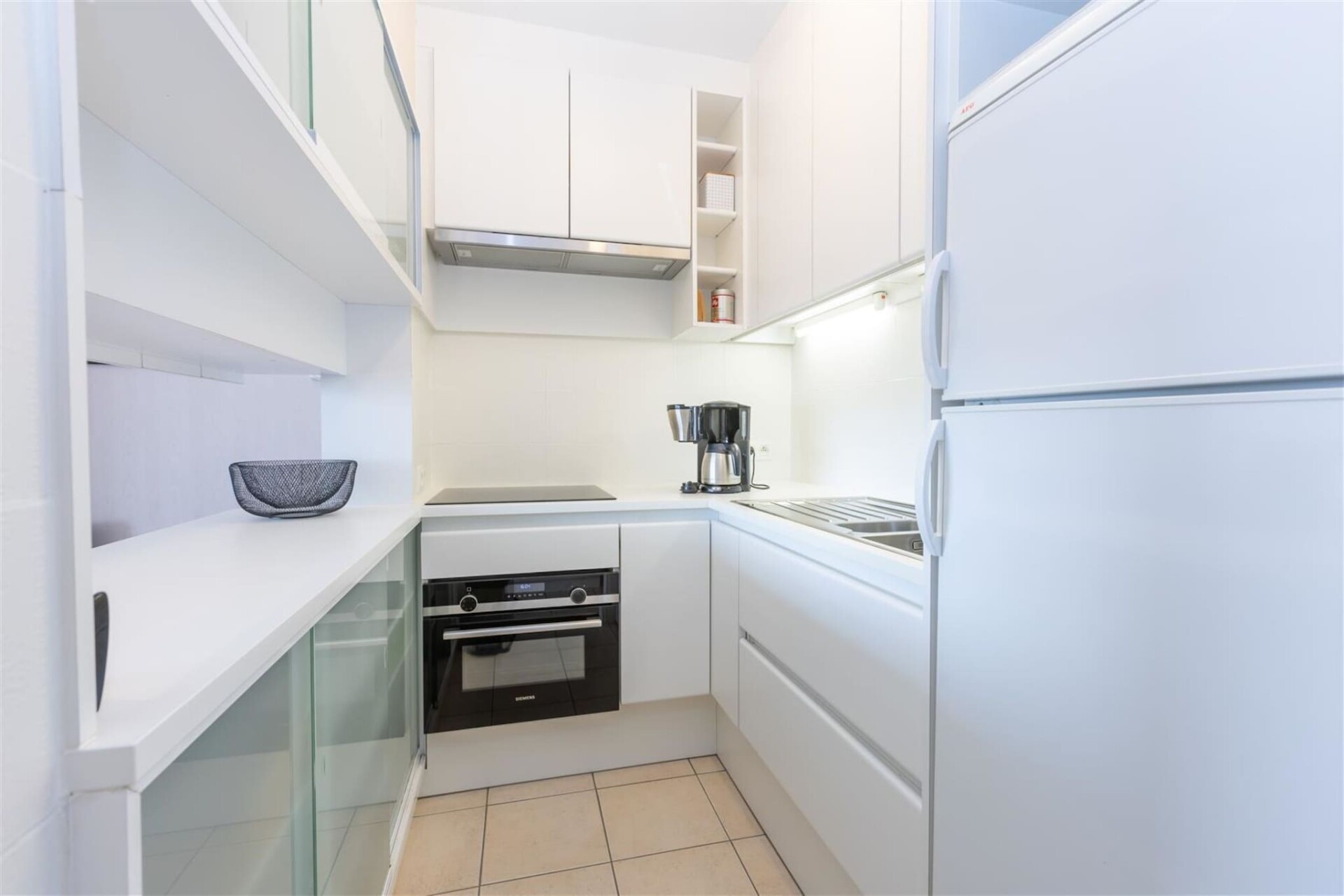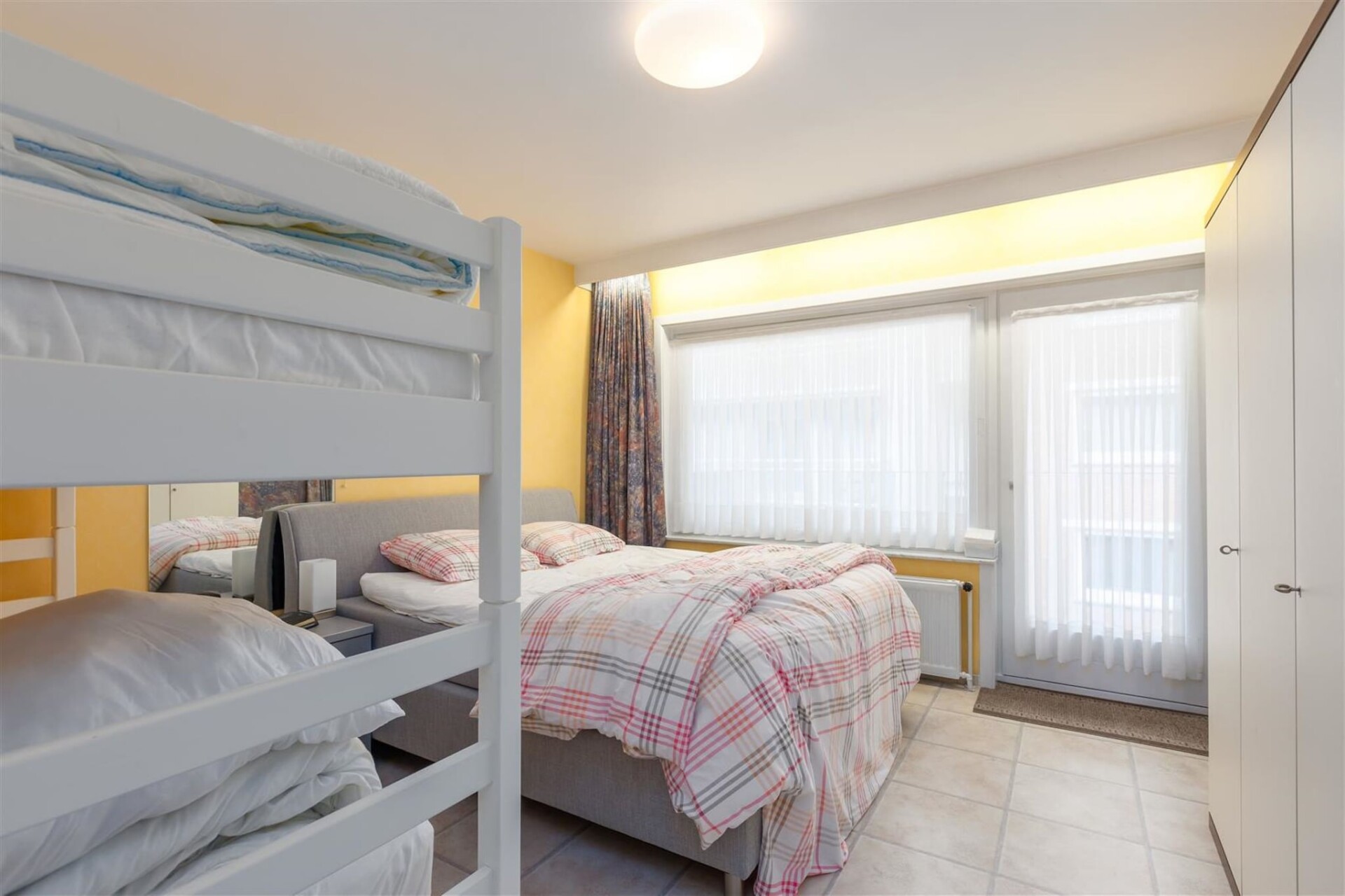 Binnen vind je een goed ingerichte ruimte die is ontworpen voor ontspanning en functionaliteit. De slaapkamer heeft 1 tweepersoonsbed en 2 stapelbedden, geschikt voor 4 gasten. De badkamer is uitgerust met een moderne inloopdouche en er is een apart toilet voor extra gemak. De woonkamer is licht en uitnodigend en biedt een gezellige sfeer om tot rust te komen na een dag op het strand. Er is een kitchenette beschikbaar voor het bereiden van heerlijke maaltijden, compleet met essentiële apparatuur en keukengerei.