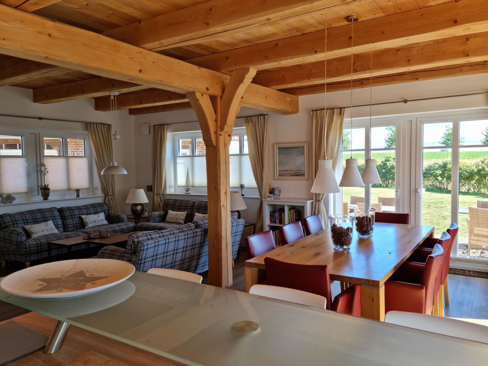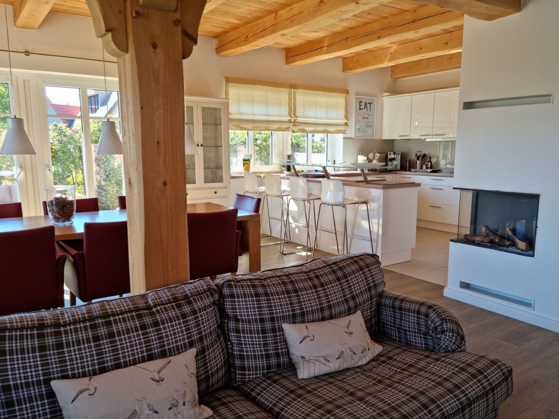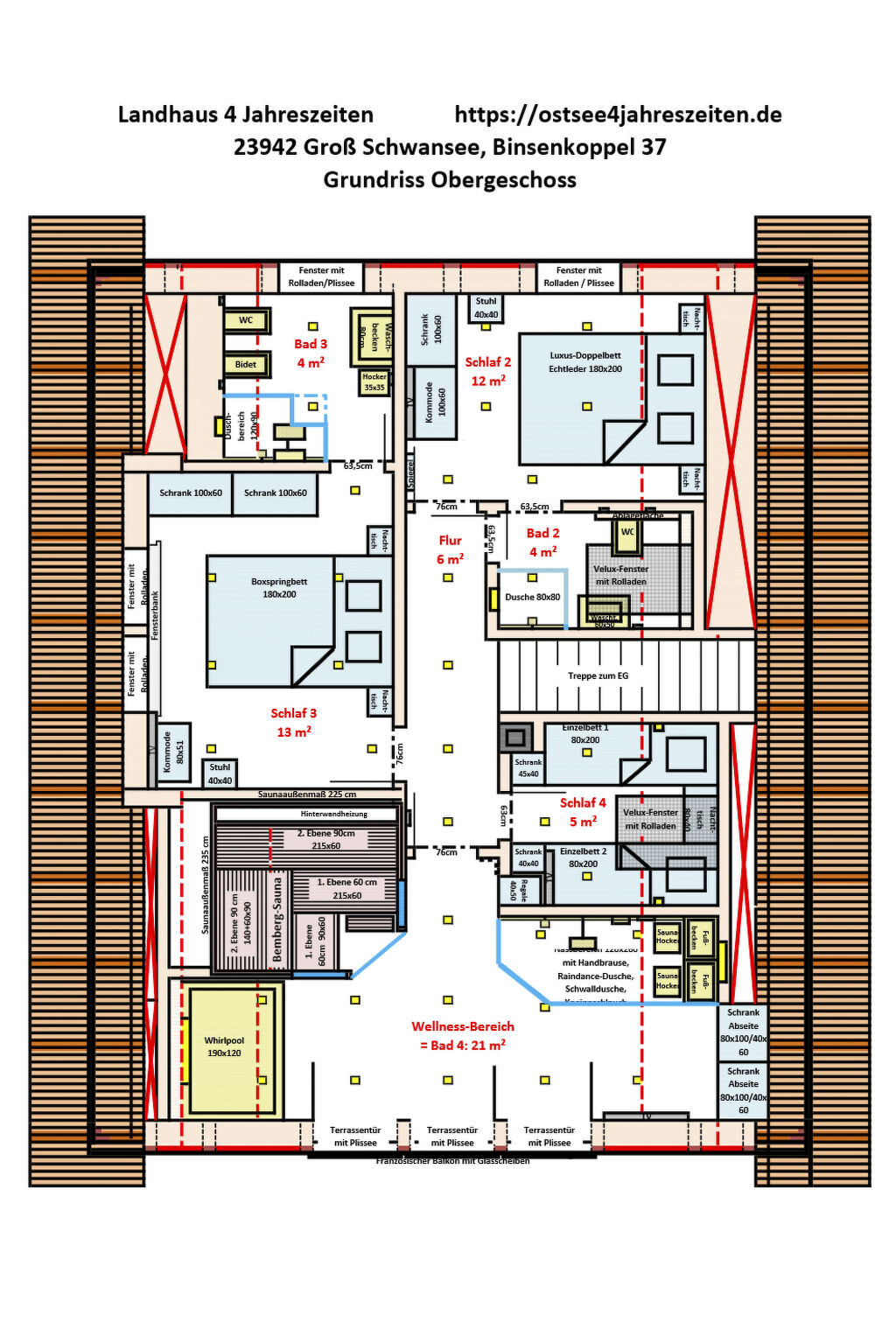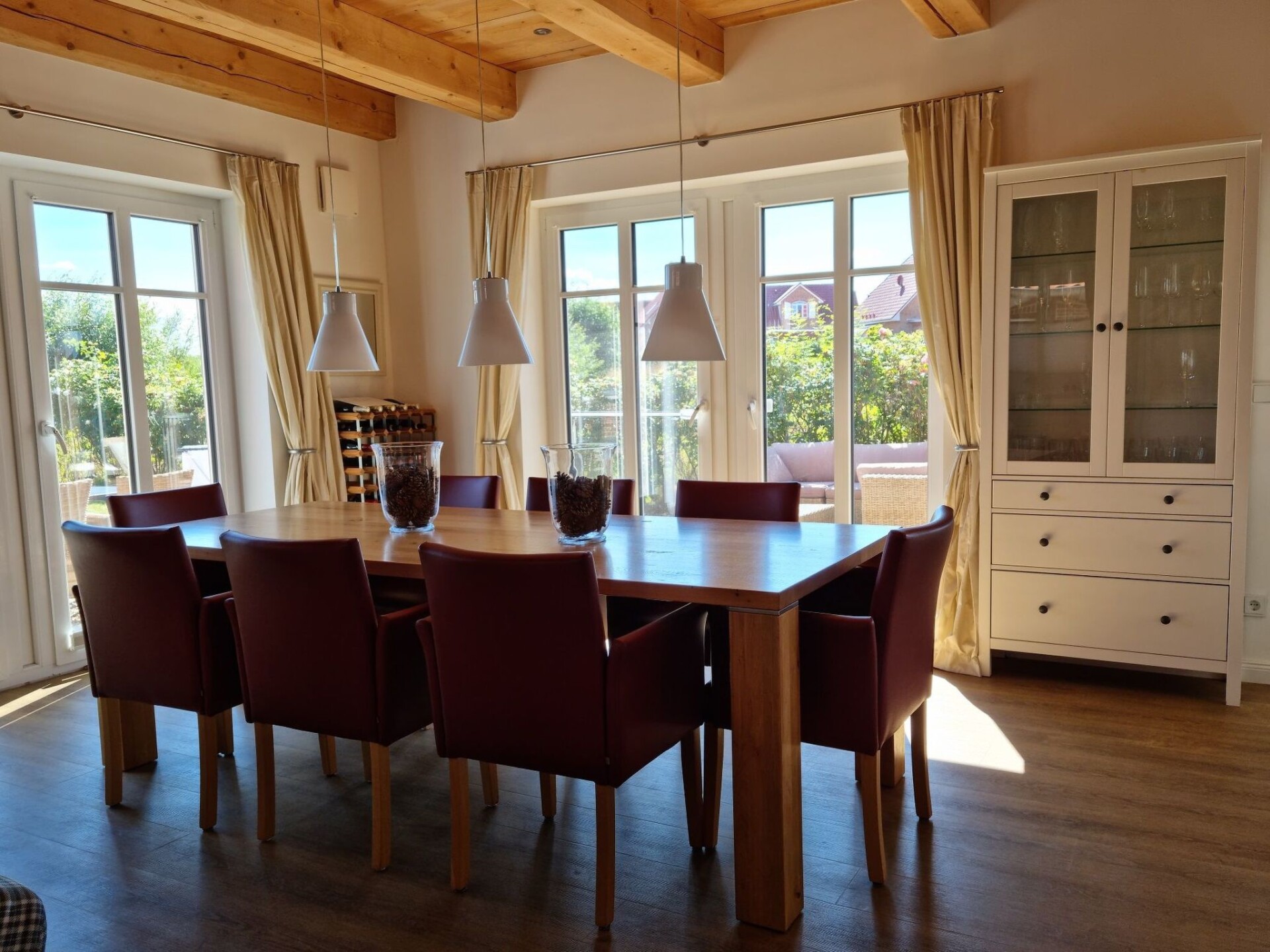 Wellness-Landhaus***** Luxury, sauna, 2x whirlpools, steam bath, fireplace, box spring, en suite bathrooms, WLAN The Landhaus 4 Jahreszeiten is located in Groß Schwansee on a 1,000m² dream property in the middle of colourful flower meadows and golden yellow rapeseed and grain fields. The Baltic Sea is within sight and the beach is just a few minutes' walk away. Groß Schwansee is located on the Baltic Sea between Travemünde (10km) and Boltenhagen (15km), in the middle of the unspoilt Mecklenburg countryside with a wonderful natural sandy beach, meadows and fields.The Landhaus 4 Jahreszeiten is perfectly equipped for your relaxation! The quietly located, modern half-timbered house was built in 2017, furnished to a high standard and decorated with great attention to detail and charm. The focus is on making your holiday as comfortable and pleasant as possible. You should want for nothing during this wonderful time. The German Tourism Association has again classified our country house 2023 for 8 people with very good results and awarded it 5 stars!!! Groups of up to 16 people can be accommodated here and in our second identical country house on the same property. In the inspection report, the DTV certifies: "A very exclusive house with great attention to detail, super furnishings, own wellness area, high-quality furnishings - simply great. Beautiful outdoor area with outdoor pool, lounge furniture and playground."With a total of 150 m² spread over two floors, you can accommodate up to 8 adults and 2 small children. There are a total of 8 beds in four bedrooms, one on the ground floor and three on the upper floor. Three bedrooms have directly adjoining en-suite bathrooms. Two of the bedrooms, one on the upper floor and one on the ground floor, are furnished with luxurious box-spring beds (180 cm x 200 cm). In the third bedroom, you sleep on a comfortable double bed (180 cm x 200 cm) in real leather with adjustable headboards. The fourth, small bedroom has two comfortable single beds (90 cm x 200 cm). Children and teenagers will feel particularly at home here. It is possible to set up children's beds in bedrooms 1-3. All bedrooms are tastefully decorated and equipped with spacious wardrobes, bedside tables with reading lamps, safes, external blinds and SMART TVs. There are 2 bedrooms for up to 4 people, 3 bedrooms for up to 6 people and 4 bedrooms for up to 8 people. Single occupancy is possible with a surcharge. If 9 or 10 people >3 years of age need to be accommodated, we can set up to 2 guest beds in the living room or wellness area.The 3 modern en-suite bathrooms spoil you with level and step-free shower areas with rain showers, elegant glass walls and illuminated storage compartments. The V&B washbasins with vanity units and additional shelves offer plenty of space for your bathroom and cosmetic accessories. There is a bidet in two of the bathrooms. Exclusive illuminated bathroom mirrors, vanity mirrors and Bluetooth radios are further highlights here.The 50 m² living and dining area offers enough space for the whole family or larger groups. You can spend relaxing hours at the large oak dining table with comfortable armchairs and space for 8-10 people as well as in the cosy living area, furnished with high-quality sofas with 8 seats. The underfloor heating and the gas fireplace, which can be booked as an option, create the perfect cosy atmosphere. A high-quality Samsung/Marantz/Elac home cinema system with 55" SMART TV, Blu-Ray player and high-end receiver are available here. Netflix streaming is installed in the TV. You can also use a Playstation PS 4 and our range of DVDs and CDs. A games collection and a holiday library with a selection for young and old are also available. We also offer you a wine depot with exquisite international wines at moderate prices.The modern open-plan kitchen with bar is fully equipped to a very high standard. Here you will find everything you need to make your stay as pleasant as possible: a fridge-freezer, ceramic hob with extractor bonnet, dishwasher and oven. For your coffee enjoyment, you can choose between a SAECO fully automatic coffee machine with integrated milk container for 6 coffee specialities and a filter coffee machine. Electrical appliances include a toaster, egg cooker, kettle, food processor and blender. A large range of pans and pots with many kitchen utensils enable you to cook perfectly and enjoyably. A large SMART TV also provides entertainment here. Elegant V&B crockery, silver cutlery and a high-quality range of glasses ensure the perfect table setting.An absolute highlight of the house is the 25 m² indoor wellness area on the upper floor with a fantastic view over meadows and fields. Enjoy the peace and quiet in the large sauna with a glass front for six people, the climatic steam bath and an indoor whirlpool 190 cm x 120 cm for 2 people. After a soothing sauna session, you can cool off under the rain shower and with the Kneipp hose before relaxing in the two Kneipp footbaths or in the deckchairs in front of the large SMART TV. For sporting activities, you are welcome to use our fitness equipment: a cross trainer, a sit-up bench, dumbbells and a gymnastics mat. ATTENTION: the indoor wellness area must be booked separately. Unfortunately, it is not possible to book individual services. Bookings can only be made for the entire holiday period.The house has its own telephone system, with which you can make free calls to all German networks. A washing machine and tumble dryer are available free of charge in the utility room.From the living and dining area you have direct access to the beautiful garden, which offers plenty of space for relaxation and recreation with a total of three furnished terraces with pool, lounge and dining areas.Our No. 1 highlight in the garden: relax in the bubbling V&B outdoor whirlpool (2.40 cm x 2.40 cm) for a total of five people at 37.5° all year round ATTENTION: the outdoor whirlpool must be booked sep