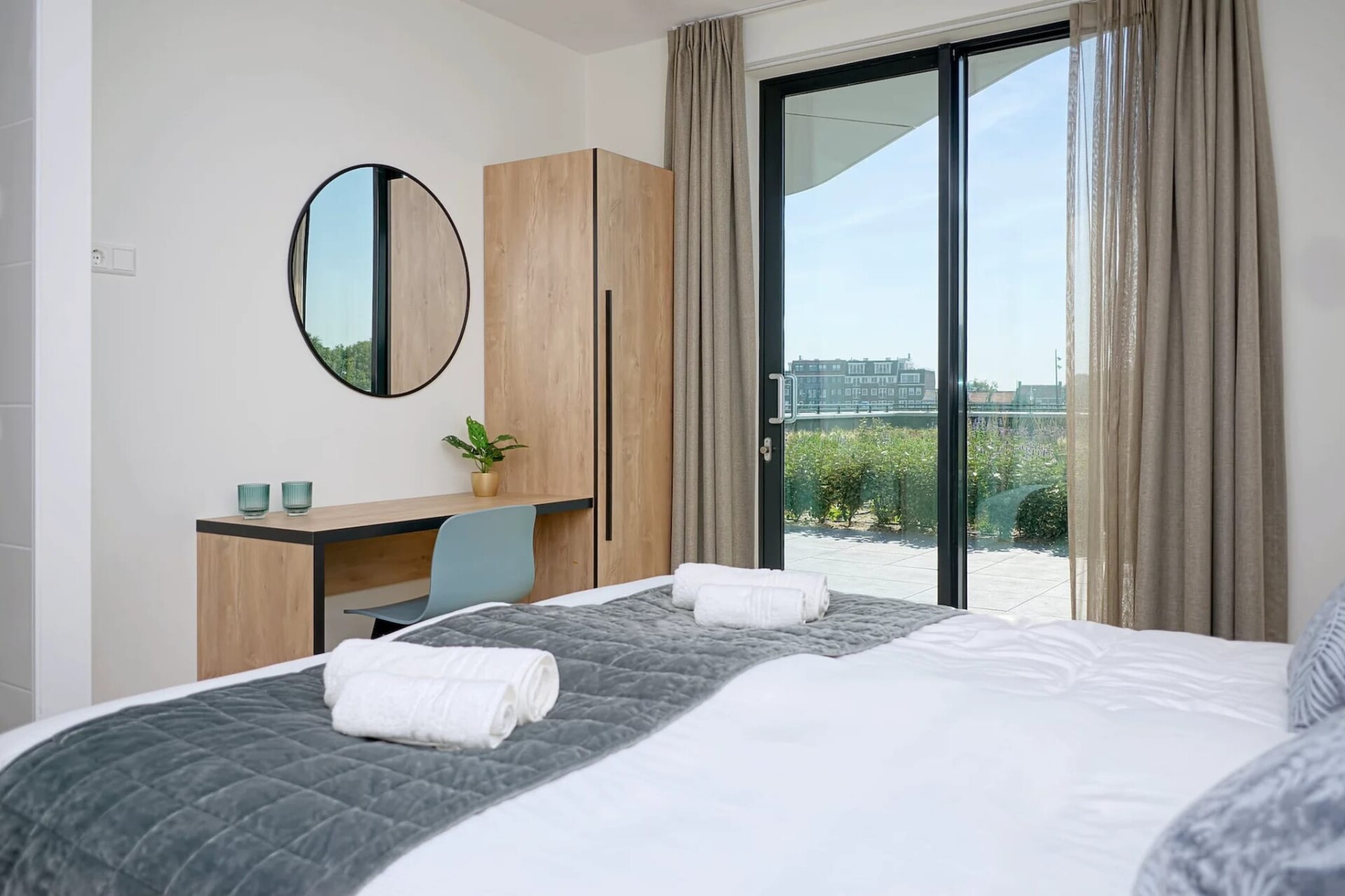 Het appartement beschikt over twee mooie slaapkamers, elk met een eigen badkamer. De eerste slaapkamer biedt een comfortabel tweepersoonsbed, een smart-tv en een moderne badkamer met een douche, wastafel en toilet. De tweede slaapkamer weerspiegelt deze opstelling en biedt nog een tweepersoonsbed, een smart-tv en een badkamer met een douche, wastafel en toilet. Voor extra gemak is er een wasmachine en een balkon en terras bieden buitenruimte om te ontspannen met tuinmeubilair.