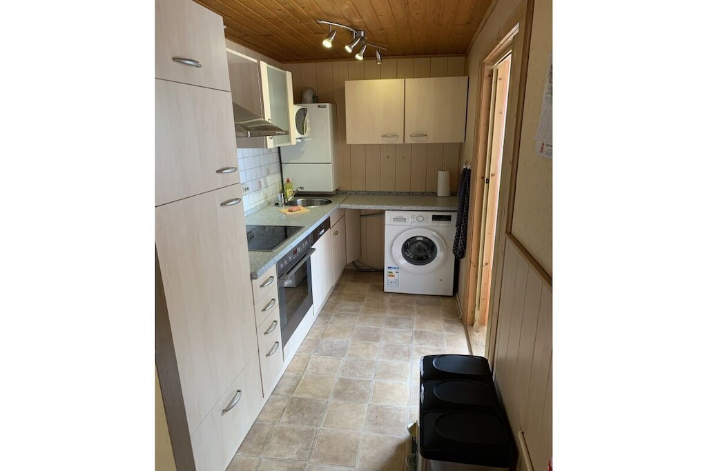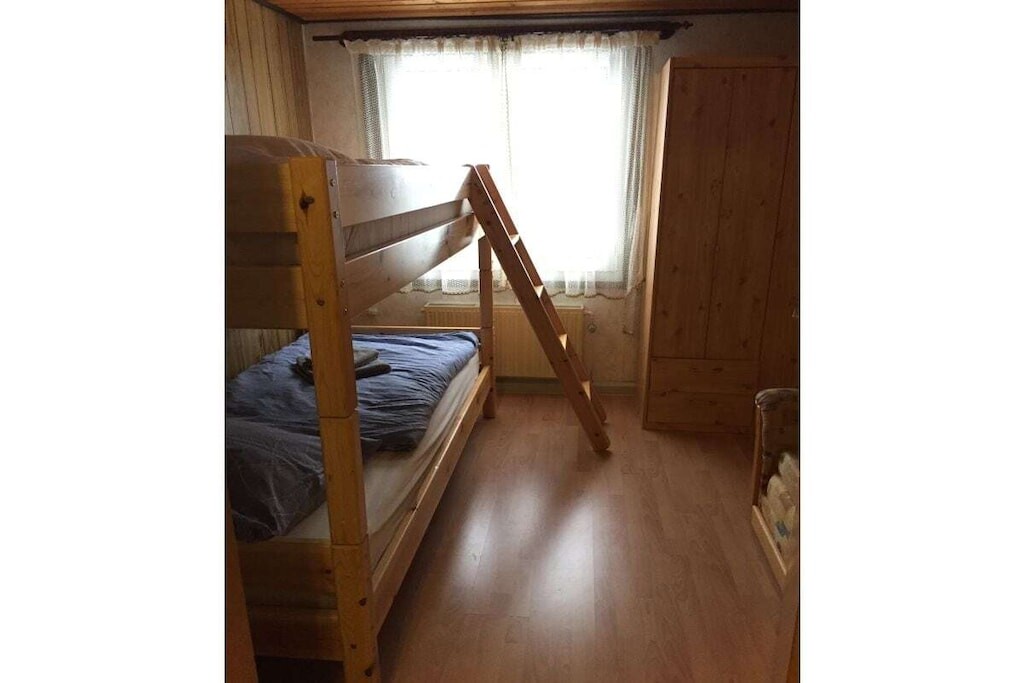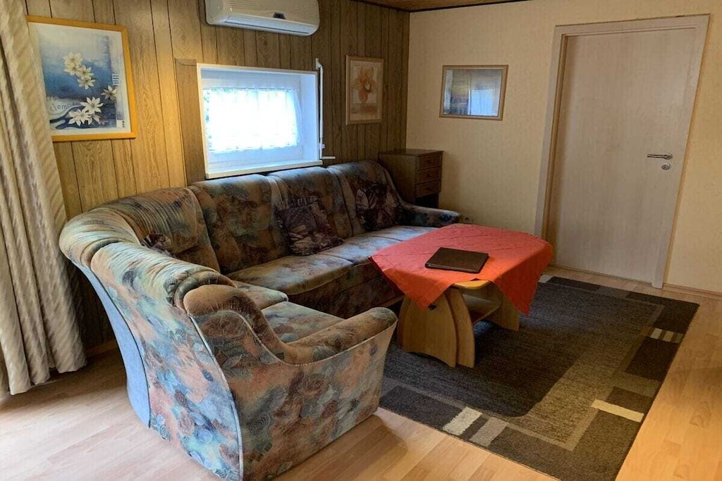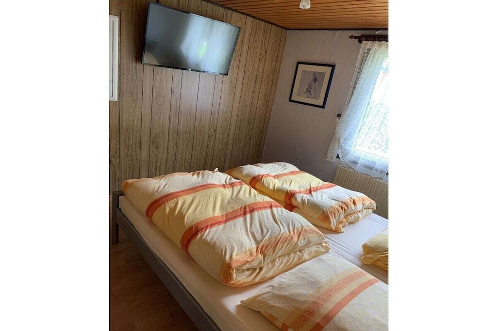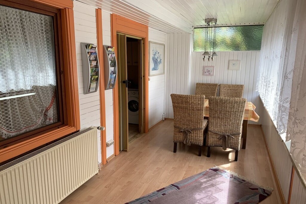 In de gedeeltelijk overdekte serre (met een zeer grote en lange raampartij) bevindt zich een eet- en ontspanningsruimte. Er is ook een slaapkamer met een tweepersoonsbed. De kinderkamer heeft een stapelbed. Er is ook een badkamer met toilet, douche en föhn. Er is ook een garage, een wasmachine en droger, een parkeerplaats en centrale verwarming op gas.