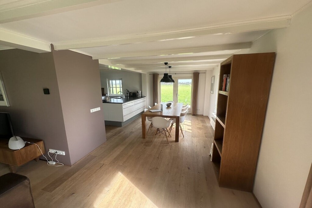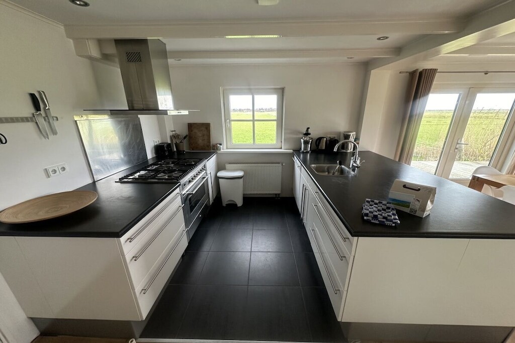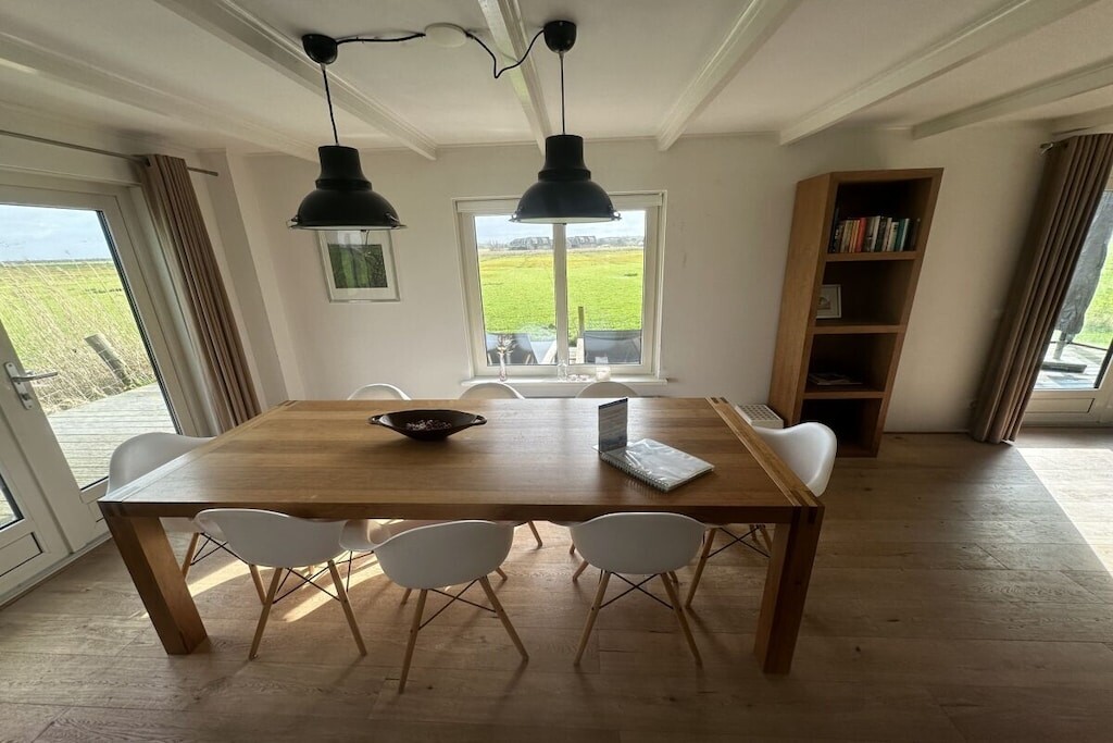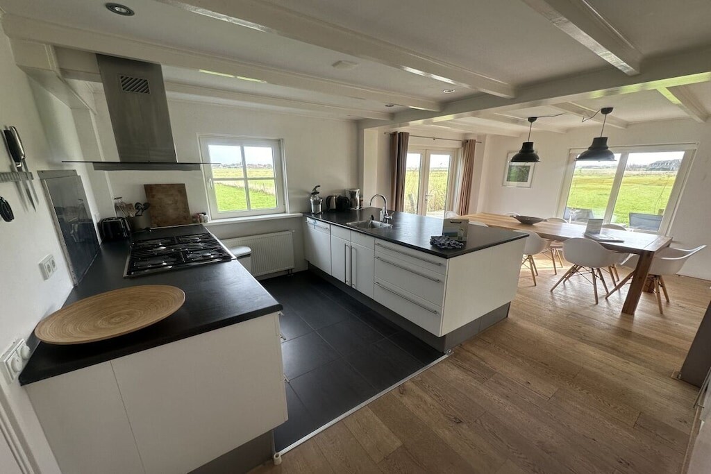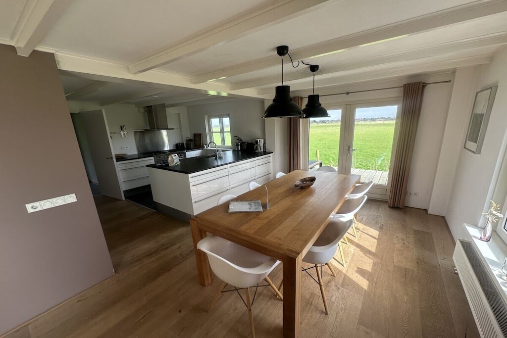 De open keuken met eettafel voor 8 personen is voorzien van een vaatwasser, oven en koelkast met vriesvak. Openslaande deuren leiden naar het gemeubileerde terras.
