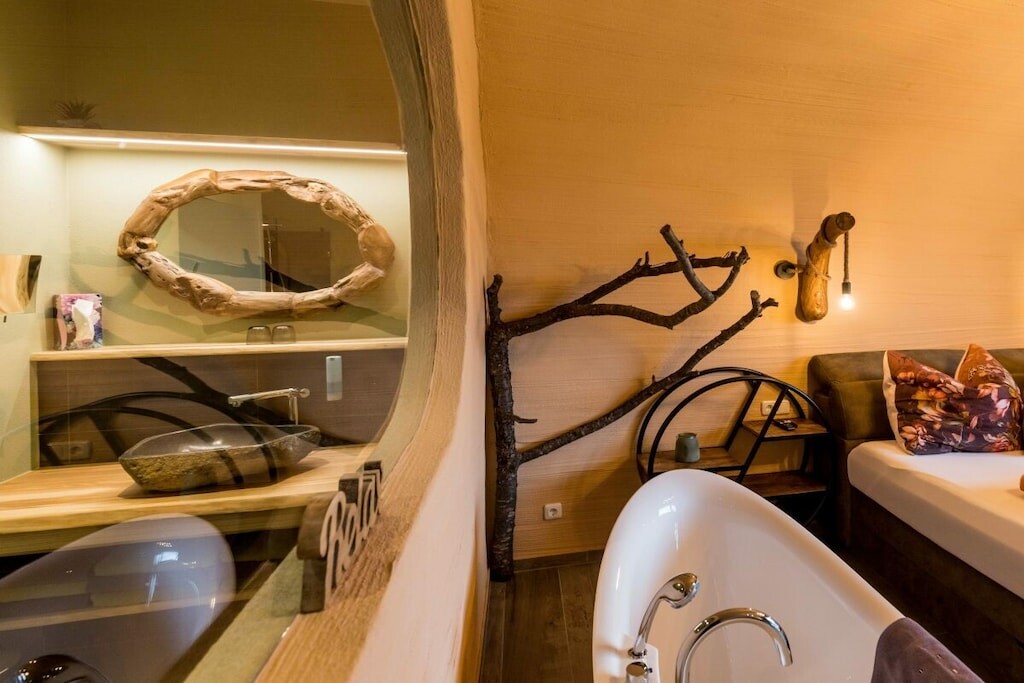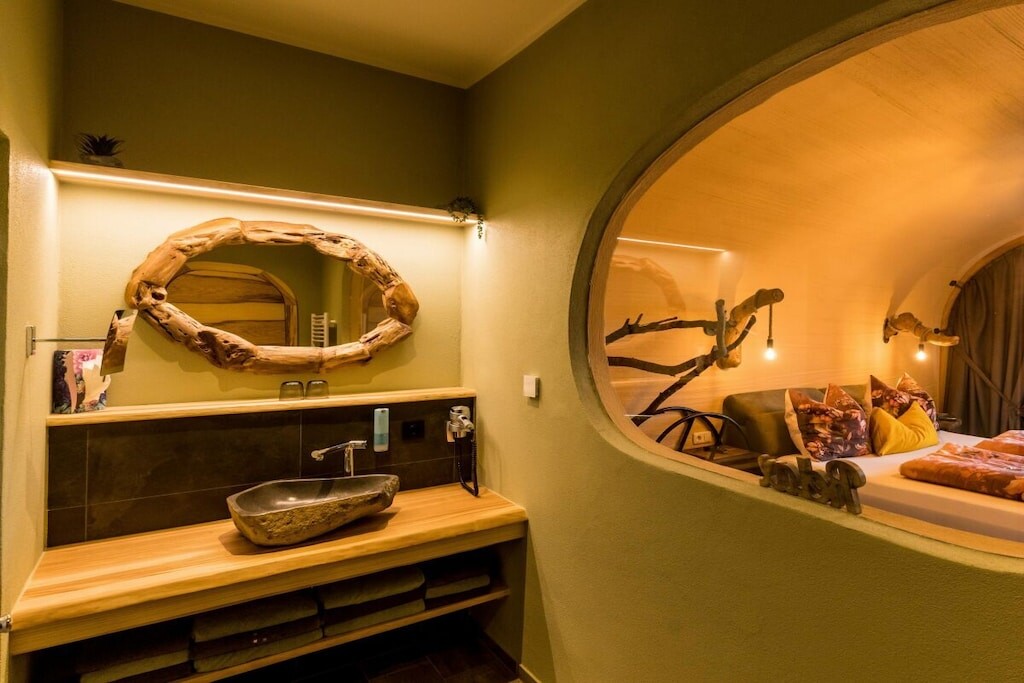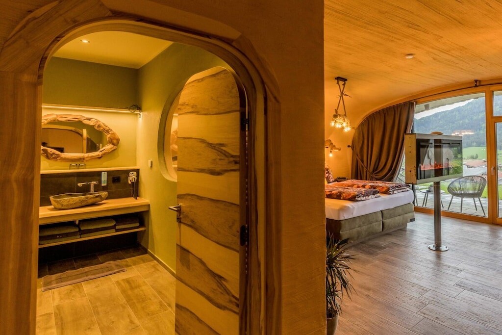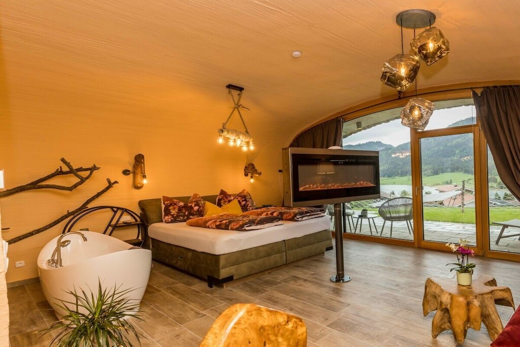 Deze exclusieve Sky Arch Suite van 43 m² biedt de perfecte ruimte voor twee personen die rust, stijl en verbondenheid met de natuur waarderen. De ruime slaapkamer met zijn sfeervolle gewelfde plafond nodigt uit tot dromen – met een comfortabele bank om te ontspannen met een boek of gewoon samen tijd door te brengen. Een bijzonder hoogtepunt is het vrijstaande bad, ideaal voor een bad met uitzicht op het meer. De ruime badkamer biedt een adembenemend uitzicht op het meer door een indrukwekkend, rond raam – het "grote oog". Een moderne douche en een apart toilet zijn eveneens aanwezig. Het ruime, gemeubileerde terras op het zuiden wordt een verlengstuk van de woonkamer – van hieruit kunt u genieten van de zon, de rust en het weidse uitzicht op het landschap en het meer.