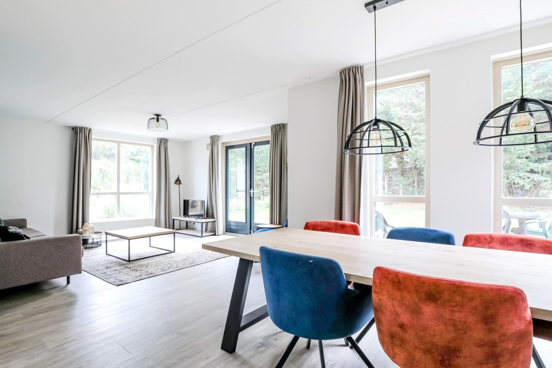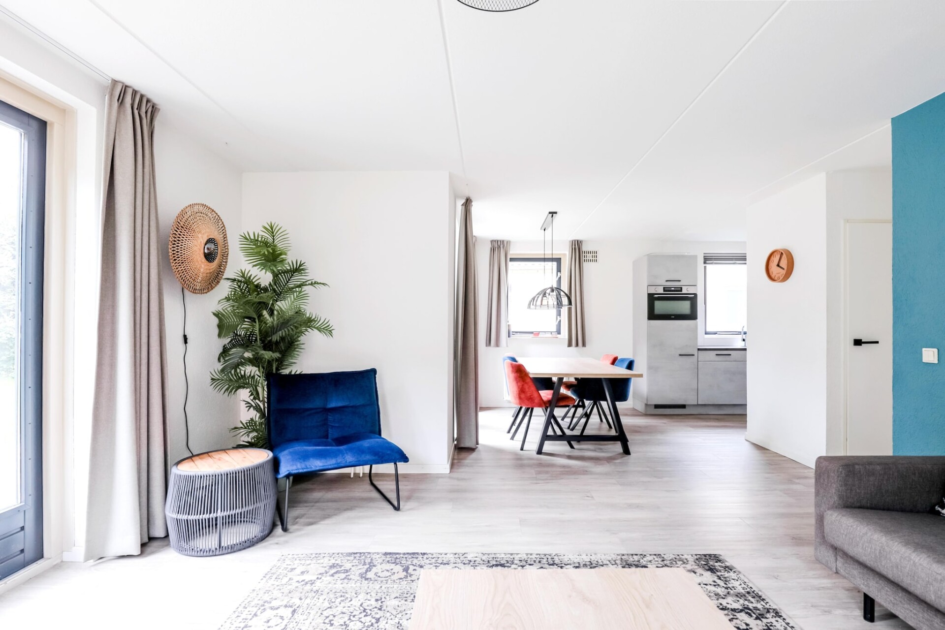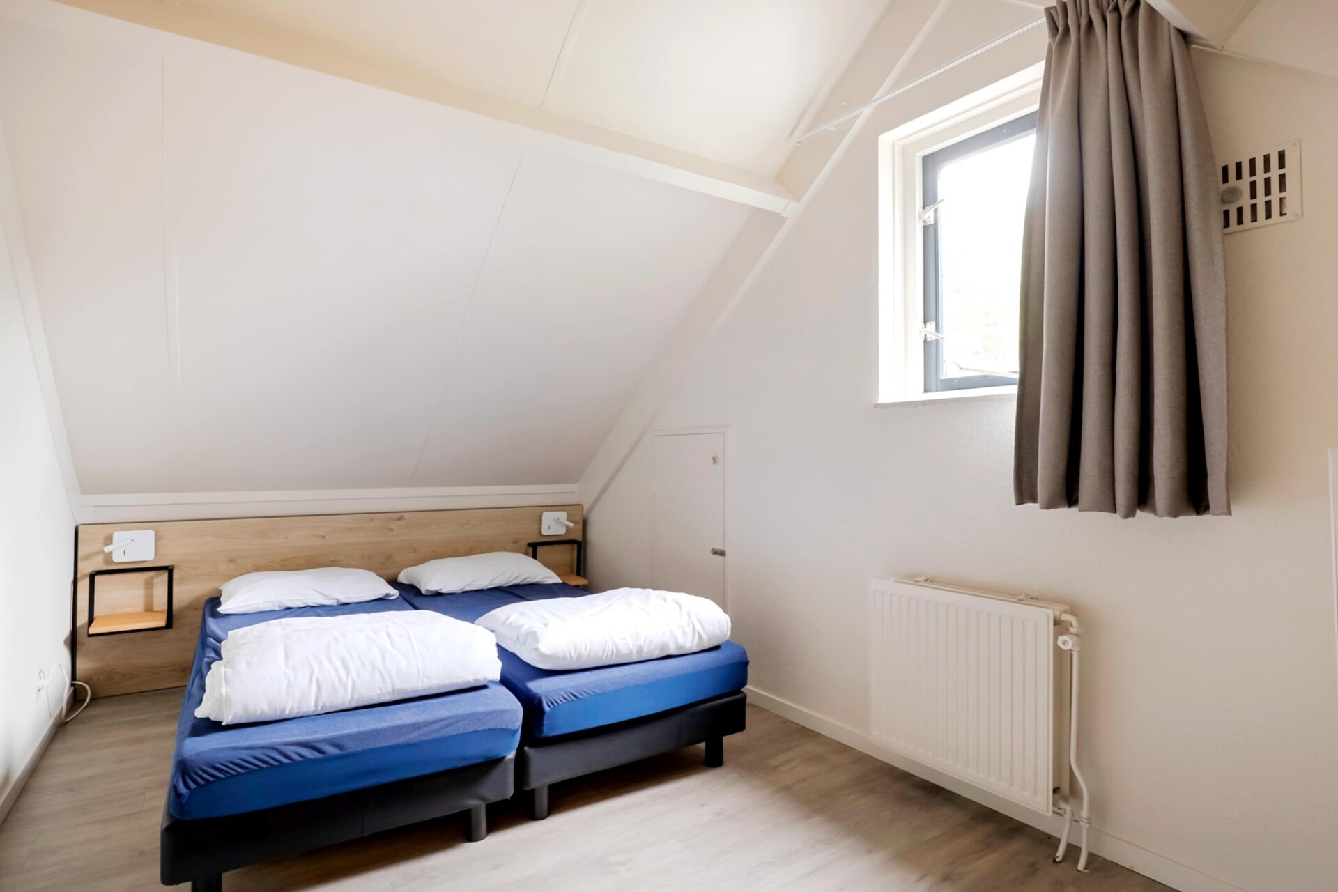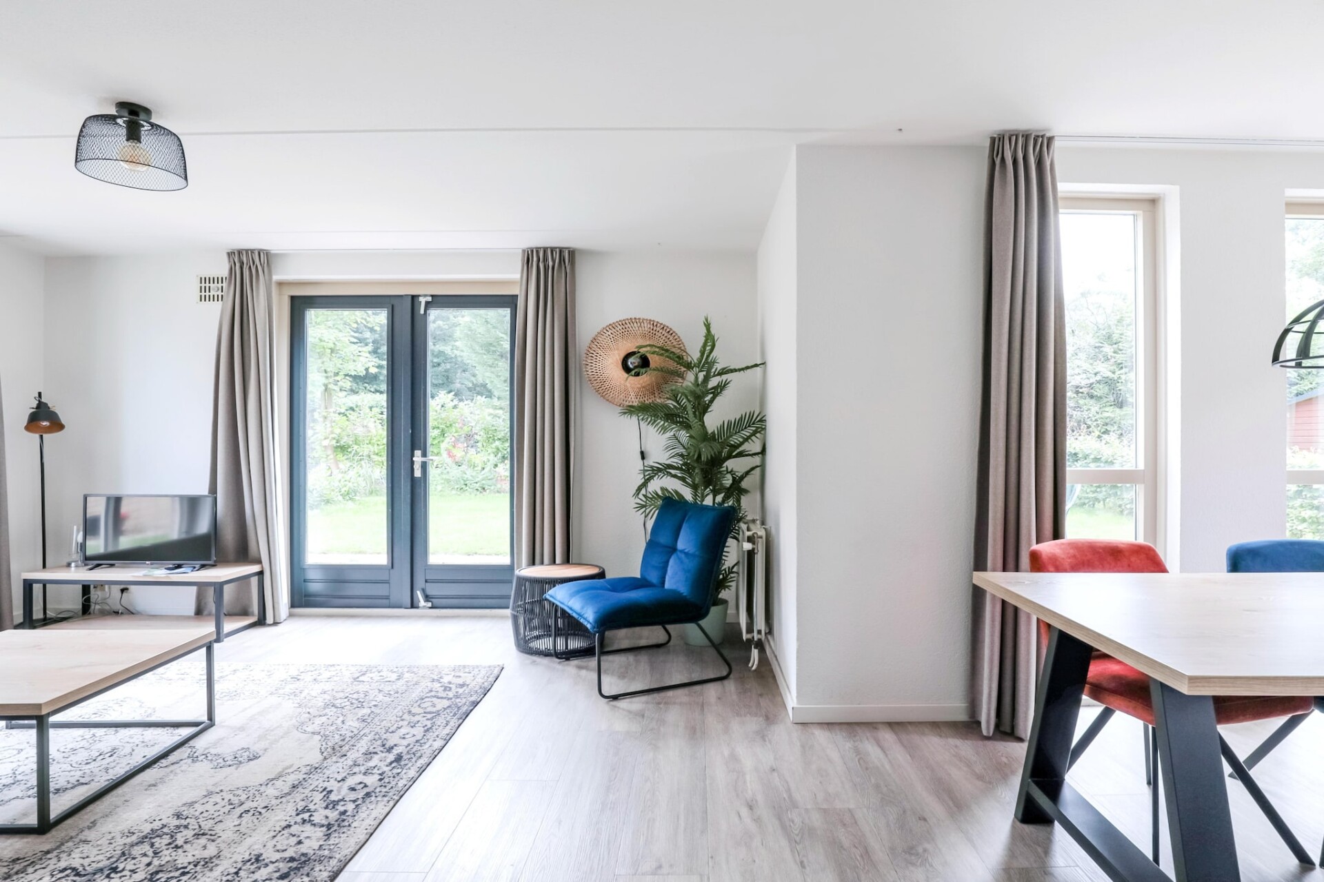 Het interieur is gelijkvloers ingericht en biedt plaats aan vier gasten. Er zijn twee slaapkamers, elk voorzien van twee eenpersoonsbedden. De woonkamer is licht en uitnodigend, met een gezellige zithoek met een tv en een eettafel. Voor wie graag zelf kookt, is de moderne keuken volledig uitgerust met een vaatwasser, oven, magnetron en koelkast. De bungalow beschikt ook over een badkamer met douche en toilet, van waaruit de privésauna gemakkelijk toegankelijk is. Essentiële voorzieningen zoals supersnelle wifi en centrale verwarming zijn aanwezig om het hele jaar door een comfortabel verblijf te garanderen.