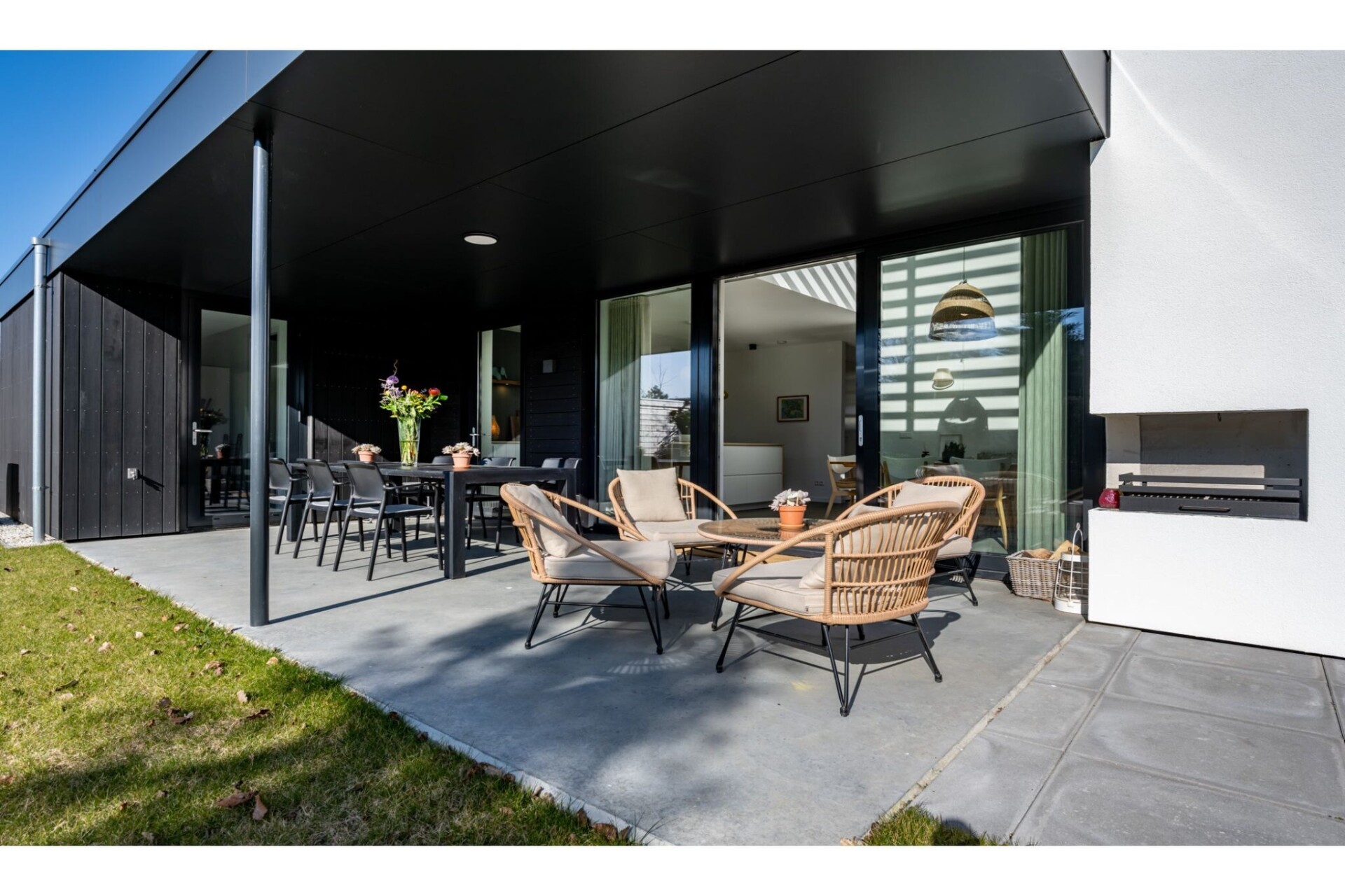 Het vakantiehuis heeft 2 verdiepingen. Op de begane grond is er een lichte en ruime woon-eetkamer en een moderne keuken, voorzien van een Nespresso koffiezetapparaat en inbouwkeukenapparatuur. De gezellige woonkamer is voorzien van een open haard en flatscreen tv. Ook heeft u de beschikking over een berging met wasmachine en droger. Vanuit de woonkamer heeft u toegang tot de ruime tuin met veel privacy, waar u heerlijk kunt genieten van lange zomerdagen. Op het overdekte terras staat een luxe tuinset met 6 tuinstoelen en een gezellige zithoek. Daarnaast is er een comfortabele loungeset en buitenhaard. Voor onze jongste gasten is er een trampoline die garant staat voor uren speelplezier!
