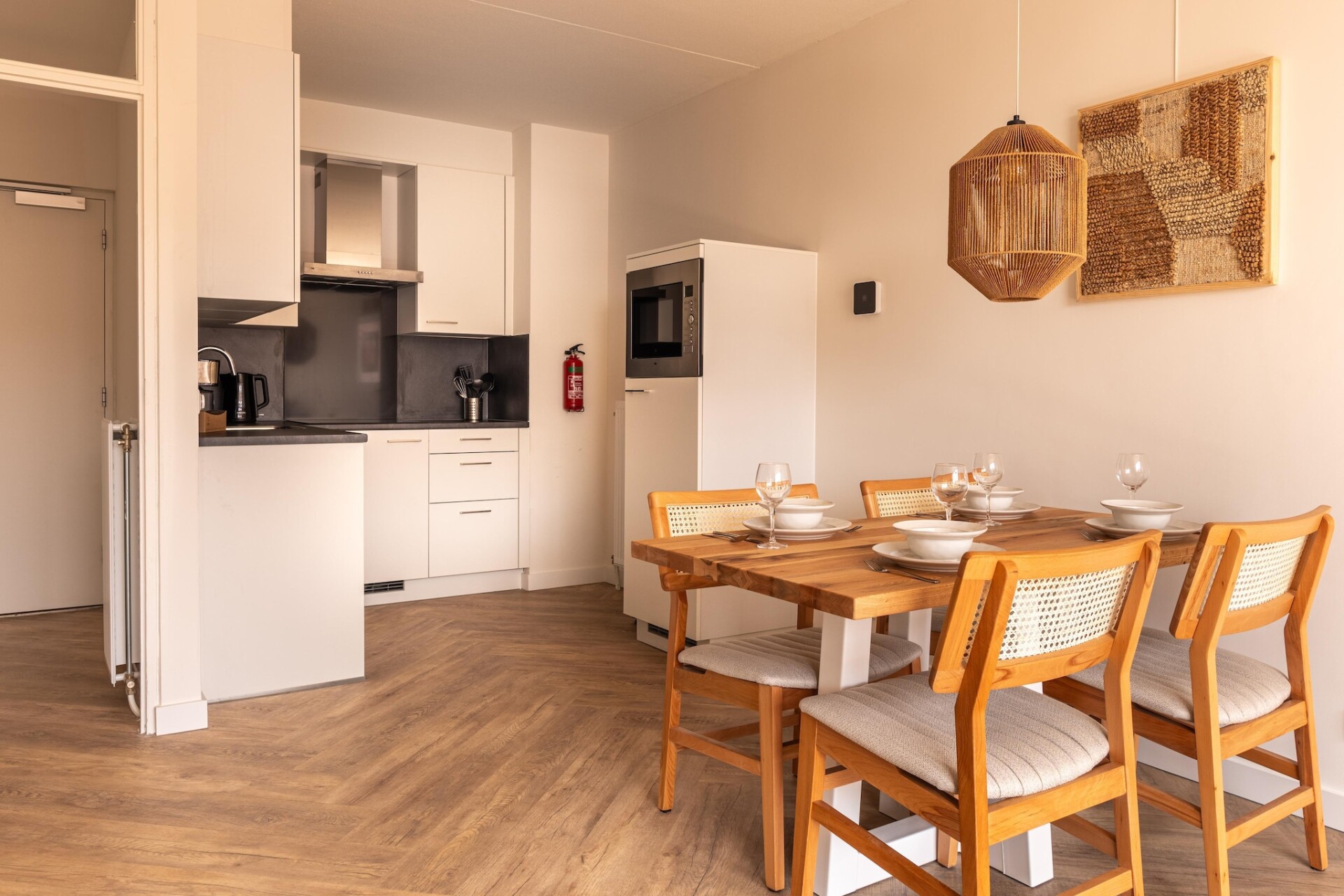 Dit moderne appartement in Summio Parc Aquadelta biedt een gastvrij toevluchtsoord voor maximaal vier gasten en combineert een stijlvol interieur met de schoonheid van Zeeland net buiten de deur. De lichte woonkamer, met comfortabele stoelen en smart tv, loopt op natuurlijke wijze over in de open keuken en eethoek, perfect voor familiemaaltijden of ontspannen avonden samen. Vanaf hier leidt een deur direct naar het gemeubileerde balkon, waar je buiten kunt dineren terwijl je uitkijkt over het groen en de rustige omgeving in je opneemt.