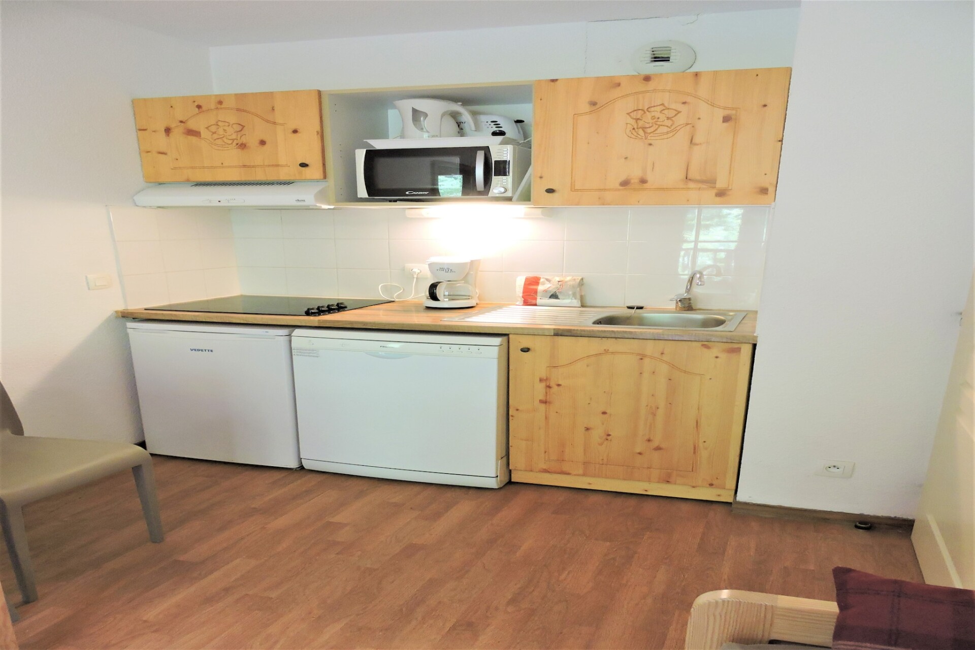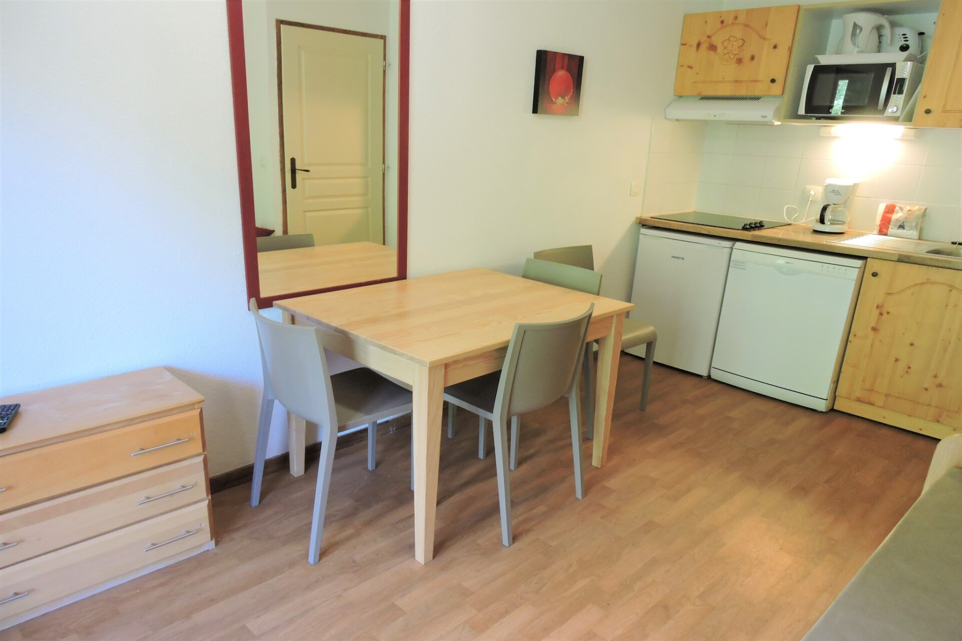 HAMEAU – FLAT 4 206 is een charmant 3-sterrenappartement op de tweede verdieping van de residentie Le Hameau des Eaux d'Orelle in het hart van de 3 Vallées in Frankrijk. Dit appartement van 26 m² is perfect voor maximaal vier gasten en beschikt over een gezellige woonkamer met een terras en televisie, en een open keuken met een koelkast, vriezer, vaatwasser, magnetron, koffiezetapparaat, waterkoker en broodrooster. De slaapgelegenheid bestaat uit een tweepersoons slaapbank in de woonkamer (2x 80x190) en twee aangrenzende eenpersoonsbedden in de slaapkamer (80x190). Het appartement beschikt over een badkamer met een bad, een apart toilet en een balkon met uitzicht op de omliggende bomen.