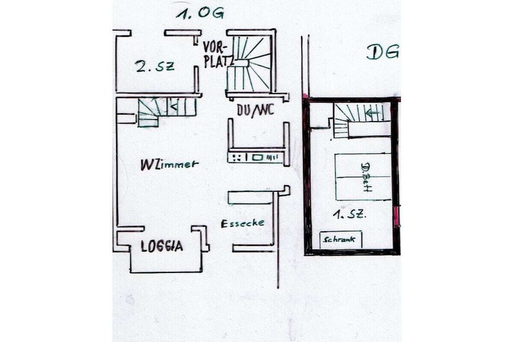 Het appartement op de 1e verdieping biedt een gezellige woonkamer met kitchenette en eethoek, een lichte badkamer met raam, douche en toilet en een kleinere kamer voor een derde persoon. Vanuit de woonkamer bereikt u via een comfortabele trap de slaapkamer.