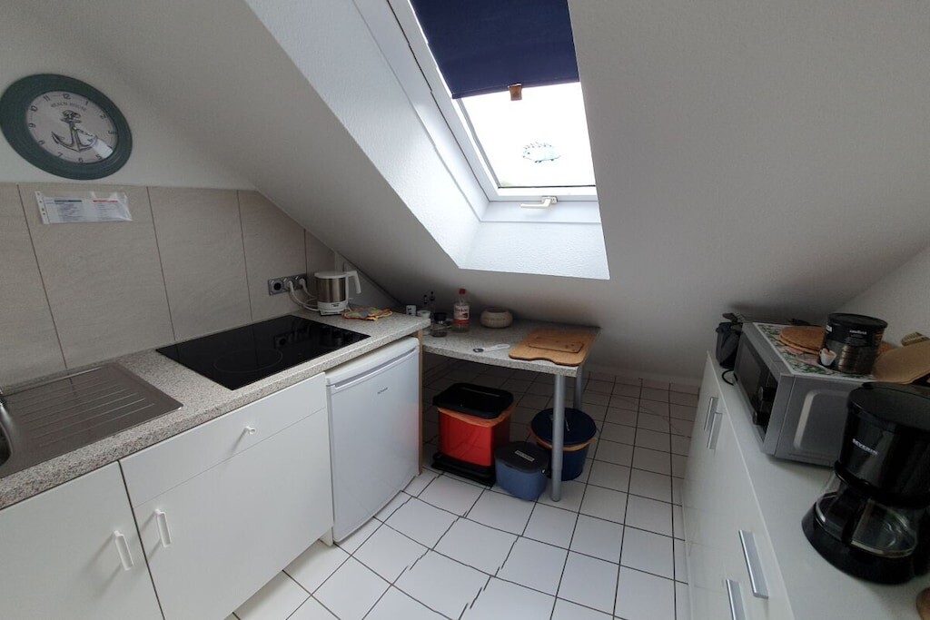 Ons vakantieappartement, gelegen in een rustige omgeving op de eerste verdieping, is 57 vierkante meter groot en beschikt over twee woon-/slaapkamers (een tweepersoons- en een eenpersoonsslaapkamer, elk met een tv), een kleine keuken (kitchenette met keramische kookplaat, magnetron met grillfunctie, broodrooster, koffiezetapparaat, spoelbak en koelkast met vriesvak), een kleine hal en een badkamer met toilet en douche.